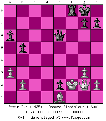 Last move : 0-1 2007 December 9 17:11:58 [Event "FICGS__CHESS__CLASS_E__000066"] [Site "FICGS"] [Date "2007.11.05"] [Round "1"] [White "Prcin,Ivo"] [Black "Dsouza,Stanislaus"] [Result "0-1"] [WhiteElo "1435"] [BlackElo "1600"] 1.d4 b6 2.e4 Bb7 3.Nc3 e6 4.g3 Nf6 5.Bg2 Bb4 6.Qd3 d5 7.e5 Ng8 8.Bd2 Ne7 9.Nge2 O-O 10.O-O Ng6 11.a3 Be7 12.f4 Nd7 13.Nd1 c5 14.c4 Qc7 15.Ndc3 Qd8 16.cxd5 exd5 17.Nxd5 Rb8 18.Nxe7+ Qxe7 19.Bxb7 Rxb7 20.d5 f5 21.Bc3 Re8 22.Rfe1 b5 23.Rad1 a6 24.d6 Qe6 25.Kf1 c4 26.Qf3 Nc5 27.Nd4 Qc8 28.Nxf5 Qxf5 29.Bb4 Qh3+ 30.Kg1 Nd3 31.Rxd3 cxd3 32.Qxb7 Nxf4 33.d7 Rd8 34.e6 Ne2+ 35.Rxe2 dxe2 36.Qg2 Qxe6 37.Be1 Rxd7 38.Qa8+ Kf7 39.Kf2 Re7 40.Qf3+ Kg8 41.Qa8+ Re8 42.Qg2 Rf8+ 0-1 Queen's pawn : English defense Kingside Castling by player Black (move 9) Kingside Castling by player White (move 10) Player Black won this chess game. Follow this game move after move (download)Chess is above all, a fight ! (Emanuel Lasker) Ich verlor meine Bürgerrechte, mein Gehalt wurde mir nicht mehr bezahlt und ich wurde zensiert und durfte nicht mehr ins Ausland reisen. [nach dem Match Fischer-Taimanov 6:0] (Mark Taimanov) Observen a Garry Kasparov. Después de una derrota, invariablemente el gana la próxima partida. Prácticamente hace pedazos a su siguiente oponente. Eso es algo que tenemos que aprender a lograr. (Maurice Ashley) Ne tendez aucun piège pour le plaisir ! Ne jouez rien dans l'espoir que l'adversaire réagisse de façon stupide ! Prenez toujours pour acquis que l'adversaire va trouver le meilleur coup ! Ne jouez jamais de coup dans l'espoir que l'adversaire ne voie pas la menace ! Chacun de vos coups doit améliorer la position d'une façon ou d'une autre. If you are going through hell, keep going. (Winston Churchill)