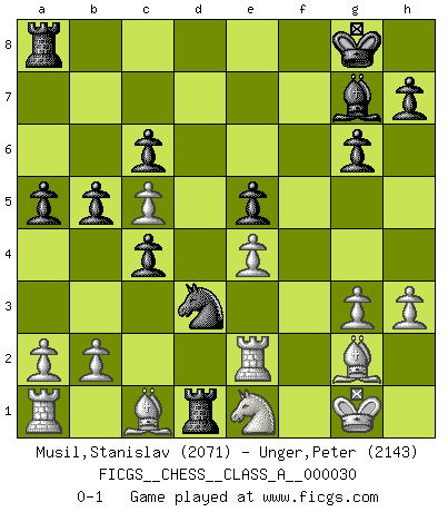 Last move : 0-1 2008 January 2 8:16:28 [Event "FICGS__CHESS__CLASS_A__000030"] [Site "FICGS"] [Date "2007.11.05"] [Round "1"] [White "Musil,Stanislav"] [Black "Unger,Peter"] [Result "0-1"] [WhiteElo "2071"] [BlackElo "2143"] 1.d4 Nf6 2.c4 g6 3.g3 Bg7 4.Bg2 d5 5.Nf3 dxc4 6.Nbd2 b5 7.Ne5 Nd5 8.Ne4 c6 9.O-O O-O 10.Nc5 a5 11.f4 f6 12.Nf3 Na6 13.Qd2 Nxc5 14.dxc5 e5 15.e4 Nb4 16.Qxd8 Rxd8 17.fxe5 fxe5 18.Ne1 Bg4 19.h3 Be2 20.Rf2 Rd1 21.Rxe2 Nd3 0-1 King's Indian : 3.g3, counterthrust variation Kingside Castling by player White (move 9) Kingside Castling by player Black (move 9) Player Black won this chess game. Follow this game move after move (download)The battle for the ultimate truth will never be won. And that's why Chess is so fascinating. (Hans Kmoch) Es hat in meinem Leben Zeiten gegeben, da ich sehr nahe daran war zu glauben, daß ich auch nicht eine einzige Schachpartie verlieren könnte. (José Raúl Capablanca) Morphy probablemente fue el genio más grande de todos. (Bobby Fischer) Ce qui est bien, c'est d'avoir tout un tas de pièces en prise : l'adversaire ne peut en prendre qu'une à la fois. Cité par Thierry Audin. I don't diet. I just don't eat as much as I'd like to. (Linda Evangelista, supermodel)