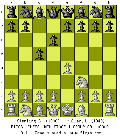 Last move : 0-1 2006 August 4 3:36:2 [Event "FICGS__CHESS__WCH_STAGE_1_GROUP_09__000001"] [Site "FICGS"] [Date "2006.07.01"] [Round "1"] [White "Starling,Stephen"] [Black "Muller,Henri-Louis"] [Result "0-1"] [WhiteElo "1200"] [BlackElo "1949"] 1.e4 c5 2.Nf3 d6 0-1 This chess game has been lost on time (started : 2006.07.01 16:11:36) Sicilian Player Black won this chess game. Follow this game move after move (download)I have added these principles to the law: get the Knights into action before both Bishops are developed. (Emanuel Lasker) Im Schach gewinnt jeder. Hat man Freunde am Spiel - und das ist die Hauptsache - ist auch der Verlust einer Partie kein Unglück. (David Bronstein) Mis oponentes también hacen buenas movidas. A veces yo no tomo esas cosas en consideración. (Bobby Fischer) Vous savez, camarade Pachman, je n'éprouve pas de plaisir à être ministre, je jouerais plutôt aux échecs comme vous, ou alors ferais une révolution au Venezuela. (Che Guevara à Ludek Pachman, 'Checkmate in Prague', 1975) I'm extremely disappointed. I send you out for exciting, new designer drugs, you come back with tomato sauce. (Gregory House, House M.D.)