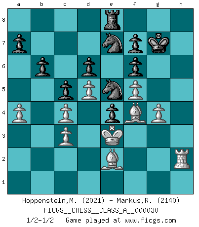 Last move : 1/2-1/2 2008 January 6 15:23:43 [Event "FICGS__CHESS__CLASS_A__000030"] [Site "FICGS"] [Date "2007.11.05"] [Round "1"] [White "Hoppenstein,Michael"] [Black "Markus,Roland"] [Result "1/2-1/2"] [WhiteElo "2021"] [BlackElo "2140"] 1.d4 Nf6 2.c4 e6 3.Nc3 Bb4 4.Qc2 O-O 5.a3 Bxc3+ 6.bxc3 d6 7.e4 e5 8.Bd3 c5 9.d5 Nbd7 10.Ne2 Re8 11.O-O Nf8 12.f3 Ng6 13.Be3 Bd7 14.Qd2 Qa5 15.Ng3 h6 16.Rfb1 Rab8 17.Nf5 Bxf5 18.exf5 Nf4 19.Bf1 Qa4 20.Re1 b6 21.g3 N4h5 22.Qd1 Qxd1 23.Raxd1 Nd7 24.Kf2 e4 25.f4 Nhf6 26.h3 h5 27.Be2 Kf8 28.g4 Ng8 29.Rg1 Nh6 30.Rde1 Kg8 31.f6 hxg4 32.hxg4 gxf6 33.f5 Kg7 34.Bf4 Ne5 35.Rh1 Rh8 36.Reg1 Rbe8 37.Rh4 Ng8 38.Rxh8 Kxh8 39.Ke3 Kg7 40.Rh1 Re7 41.a4 Re8 42.Rh2 Ne7 1/2-1/2 Nimzo-Indian : Classical variation Kingside Castling by player Black (move 4) Kingside Castling by player White (move 11) This chess game ended in a draw. Follow this game move after move (download)The passed pawn is a criminal, who should be kept under lock and key. Mild measures, such as police surveillance, are not sufficient. (Nimzovitch) Auf jeden Fall musst du zuerst Rechtsanwalt werden, damit du deine eigenen Interessen und die deiner Familie vertreten kannst. [Brief an seinen Sohn] (José Raúl Capablanca) Yo no le temo a Spassky. Todos saben que yo soy el mejor. Uno no necesita un torneo para probarlo. (Bobby Fischer) Karpov est une pièce de musée. (Garry Kasparov) Fear is the path to the dark side. Fear leads to anger; anger leads to hate; hate leads to suffering. I sense much fear in you. (Master Yoda in Star Wars ep.1)