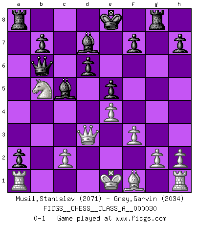 Last move : 0-1 2008 March 24 17:1:14 [Event "FICGS__CHESS__CLASS_A__000030"] [Site "FICGS"] [Date "2007.11.05"] [Round "1"] [White "Musil,Stanislav"] [Black "Gray,Garvin"] [Result "0-1"] [WhiteElo "2071"] [BlackElo "2034"] 1.d4 Nf6 2.Bg5 Ne4 3.Bh4 c5 4.f3 Nf6 5.dxc5 e6 6.b4 a5 7.Nd2 axb4 8.Ne4 Qa5 9.Nxf6 gxf6 10.Bxf6 Rg8 11.Qd2 Bxc5 12.e3 Nc6 13.Ne2 Qb6 14.Bd4 Nxd4 15.Nxd4 e5 16.Nb5 d6 17.a4 bxa3 18.e4 Bd7 19.Qd3 a2 0-1 This chess game has been lost on time (started : 2007.11.05 14:2:19) Trompowsky attack (Ruth, Opovcensky Opening) Player Black won this chess game. Follow this game move after move (download)Man is a frivolous, a specious creature, and like a Chess player, cares more for the process of attaining his goal than for the goal itself. (Dostoyevsky) Modernes Schach sorgt sich zuviel um Dinge wie Bauernstruktur usw. Vergessen Sie das, Schachmatt beendet das Spiel! (Nigel Short) El Ajedrez es el arte del análisis. (Mikhail Botvinnik) Vous n'êtes pas toujours obligé de jouer le meilleur coup. Un coup doit être actif, entreprenant, correct et beau ! (David Bronstein) Experiences are the keys to life. (Daniel Parmet)