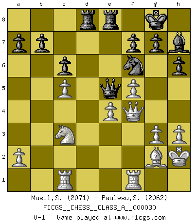 Last move : 0-1 2008 July 19 15:36:41 [Event "FICGS__CHESS__CLASS_A__000030"] [Site "FICGS"] [Date "2007.11.05"] [Round "1"] [White "Musil,Stanislav"] [Black "Paulesu,Sebastiano"] [Result "0-1"] [WhiteElo "2071"] [BlackElo "2062"] 1.Nf3 Nf6 2.g3 d5 3.Bg2 c6 4.O-O Bg4 5.Ne5 Bh5 6.b3 e6 7.d4 Nbd7 8.Nd3 Bd6 9.c4 O-O 10.Bf4 Qe7 11.Nc3 dxc4 12.bxc4 e5 13.c5 Bc7 14.Be3 Ng4 15.Qd2 exd4 16.Bxd4 Rfd8 17.h3 Ngf6 18.Ra1b1 Rab8 19.Qg5 Bg6 20.e4 h6 21.Qe3 Ne5 22.Bxe5 Bxe5 23.Nxe5 Qxe5 24.f4 Qe7 25.f5 Bh7 26.Rbc1 Qe5 27.Kh2 Re8 28.Qf4 Rbd8 0-1 Reti Opening Kingside Castling by player White (move 4) Kingside Castling by player Black (move 9) Player Black won this chess game. Follow this game move after move (download)You know, comrade Pachman, I don't enjoy being a Minister, I would rather play Chess like you. (Che Guevara) Warum muß ich gegen diesen IDIOTEN verlieren? (Aaron Nimzowitsch) El Ajedrez moderno está demasiado preocupado con cosas como la estructura de Peones. Olvidenlo, el Jaque Mate termina la partida. (Nigel Short) Même si vous avez un bon coup à faire, regardez toujours s'il n'y en a pas un qui lui soit préférable. (Pedro Damiano) CHESS, n. f. [echecs, Fr.] A nice and abstruse game, in which two sets of puppets are moved in opposition to each other. (Dr Samuel Johnson, A Dictionary Of The English Language, 1755)