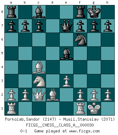 Last move : 0-1 2008 February 17 13:36:19 [Event "FICGS__CHESS__CLASS_A__000030"] [Site "FICGS"] [Date "2007.11.05"] [Round "1"] [White "Porkolab,Sandor"] [Black "Musil,Stanislav"] [Result "0-1"] [WhiteElo "2147"] [BlackElo "2071"] 1.c4 Nf6 2.Nc3 e6 3.d4 Bb4 4.Qc2 Nc6 5.e3 d5 6.Nf3 O-O 7.Bd3 dxc4 8.Bxc4 Bd6 9.O-O e5 10.dxe5 Nxe5 11.Nxe5 Bxe5 12.Bd2 Qe7 0-1 This chess game has been lost on time (started : 2007.11.05 14:2:19) English Opening Kingside Castling by player Black (move 6) Kingside Castling by player White (move 9) Player Black won this chess game. Follow this game move after move (download)Chess is mental torture. (Garry Kasparov) Spielt Blackmar-Diemer-Gambit, und das Matt kommt von selbst! (Emil Joseph Diemer) Yo considero que Fischer es uno de los expertos mas grandes de aperturas de siempre. (Keith Hayward) Demandez au pauvre Cg1 ce qu'il en pense. Eduard Gufeld à propos de la variante Saemisch de l'Est-Indienne. Life is verb, not a noun. (Charlotte Perkins Gilman)