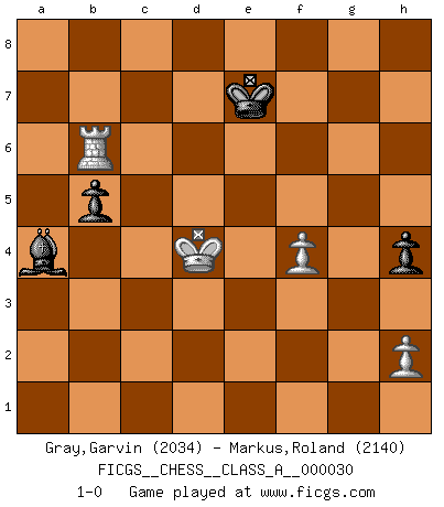 Last move : 1-0 2008 March 12 15:17:48 [Event "FICGS__CHESS__CLASS_A__000030"] [Site "FICGS"] [Date "2007.11.05"] [Round "1"] [White "Gray,Garvin"] [Black "Markus,Roland"] [Result "1-0"] [WhiteElo "2034"] [BlackElo "2140"] 1.e4 c6 2.d4 d5 3.exd5 cxd5 4.c4 Nf6 5.Nc3 e6 6.Nf3 Bb4 7.cxd5 Nxd5 8.Qc2 Nc6 9.Bc4 Nb6 10.Bd3 Nxd4 11.Nxd4 Qxd4 12.O-O Qh4 13.Be3 O-O 14.Rad1 f5 15.g3 Qe7 16.a3 Bxc3 17.Bxb6 axb6 18.Qxc3 Rd8 19.Qb3 Ra5 20.Bb5 h6 21.Rxd8+ Qxd8 22.Rd1 Qc7 23.a4 Kh7 24.Rd3 Ra8 25.Qc3 Qe7 26.Qe5 h5 27.Qd6 Qxd6 28.Rxd6 Kg6 29.Rd8 Kf6 30.Bd7 Bxd7 31.Rxa8 e5 32.f4 Bc6 33.b4 exf4 34.gxf4 Ke6 35.Kf2 h4 36.b5 Be4 37.Rc8 Kd6 38.Rg8 Bc2 39.Rxg7 Bxa4 40.Rxb7 Kc5 41.Rf7 Kxb5 42.Rxf5+ Kc6 43.Ke3 b5 44.Kd4 Kd6 45.Rf6+ Ke7 46.Rb6 1-0 Caro-Kann : Panov-Botvinnik attack, 5...e6 Kingside Castling by player White (move 12) Kingside Castling by player Black (move 13) 10 pieces endgame at move 40 : White KRPPP , Black KBPPP WHITE : King + 1 Rook 3 Pawns BLACK : King + 1 Bishop 3 Pawns 9 pieces endgame at move 41 : White KRPP , Black KBPPP WHITE : King + 1 Rook 2 Pawns BLACK : King + 1 Bishop 3 Pawns 8 pieces endgame at move 42 : White KRPP , Black KBPP WHITE : King + 1 Rook 2 Pawns BLACK : King + 1 Bishop 2 Pawns Player White won this chess game. Follow this game move after move (download)Blessed be the memory of him who gave the world this immortal game. (A. G. Gardiner) Ich bin Weltmeister und muß mit niemandem irgend etwas diskutieren. (Viswanathan Anand) Por esta medida (el intervalo entre Fischer y sus contemporaneos), yo le considero el mas grande campeón mundial. (Garry Kasparov) RxDa4 pat (...) A woman without a man is like a fish without a bicycle. (Gloria Steinem)