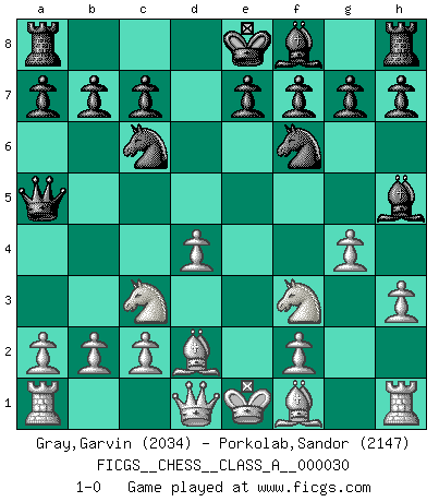 Last move : 1-0 2008 January 15 11:14:12 [Event "FICGS__CHESS__CLASS_A__000030"] [Site "FICGS"] [Date "2007.11.05"] [Round "1"] [White "Gray,Garvin"] [Black "Porkolab,Sandor"] [Result "1-0"] [WhiteElo "2034"] [BlackElo "2147"] 1.e4 d5 2.exd5 Qxd5 3.Nc3 Qa5 4.d4 Nf6 5.Nf3 Bg4 6.h3 Bh5 7.Bd2 Nc6 8.g4 1-0 This chess game has been lost on time (started : 2007.11.05 14:2:19) Scandinavian defense, Lasker variation Player White won this chess game. Follow this game move after move (download)Chess is a forcing house where the fruits of character can ripen more fully than in life. (Edward Morgan Foster) Du weisst es gibt ein Problem mit Computern und Fernschach, wenn jeder eine Rating von 2450 hat. (John Christen Knudsen) Diferente gente reacciona diferentemente en aceptar la derrota. (Bobby Fischer) Avant la finale, les dieux ont créé le milieu de partie. (Tarrasch) In my experience, there's no such thing as luck. (Obi-Wan Kenobi in Star Wars ep.4)