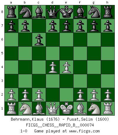 Last move : 1-0 2007 November 16 21:21:17 [Event "FICGS__CHESS__RAPID_B__000074"] [Site "FICGS"] [Date "2007.11.06"] [Round "1"] [White "Behrmann,Klaus"] [Black "Pusat,Selim"] [Result "1-0"] [WhiteElo "1676"] [BlackElo "1600"] 1.e4 c6 2.d4 1-0 Caro-Kann defense Player White won this chess game. Follow this game move after move (download)I believe that Chess possesses a magic that is also a help in advanced age. A rheumatic knee is forgotten during a game of Chess and other events can seem quite unimportant in comparison with a catastrophe on the chessboard. (Vlastimil Hort) Vielleicht wirkt die Aura früherer Spieler glanzvoller als die der heutigen Spieler, aber das liegt daran, dass man kein Programm wie Fritz hatte, das einem all die Löcher in ihren Partien zeigt. (Vladimir Kramnik) El Ajedrez es despiadado: debes de estar preparado para matar gente. (Nigel Short) 'L'échange des dames est un coup dur pour les deux adversaires...' Un journaliste lors d'une partie du match Spassky-Fischer Now you put water in a cup, it becomes the cup; You put water into a bottle it becomes the bottle; You put it in a teapot it becomes the teapot. Water can flow or it can crash. Be water, my friend. (Bruce Lee)