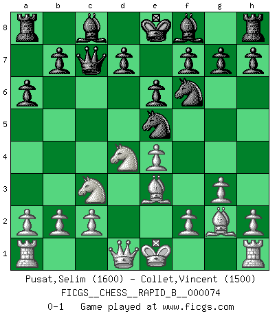 Last move : 0-1 2007 December 21 21:33:58 [Event "FICGS__CHESS__RAPID_B__000074"] [Site "FICGS"] [Date "2007.11.06"] [Round "1"] [White "Pusat,Selim"] [Black "Collet,Vincent"] [Result "0-1"] [WhiteElo "1600"] [BlackElo "1500"] 1.e4 c5 2.Nf3 Nc6 3.d4 cxd4 4.Nxd4 e6 5.Nc3 Qc7 6.g3 a6 7.Be3 Nf6 8.Bg2 Ne5 0-1 This chess game has been lost on time (started : 2007.11.06 15:59:42) Sicilian defense Player Black won this chess game. Follow this game move after move (download)Chess is so inspiring that I do not believe a good player is capable of having an evil thought during the game. (Wilhelm Steinitz) Es ist besser die Steine des Gegners zu opfern. (Savielly Grigorievitsch Tartakower) Yo no creo en la psicología. Yo creo en las buenas movidas. (Bobby Fischer) La victoire dans une partie d'Echecs appartient la plupart du temps à celui qui voit un peu plus loin que l'adversaire. (Lasker) Heh, heh, heh. Time to abandon ship. (General Grievous in Star Wars ep.3)