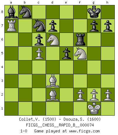 Last move : 1-0 2008 January 7 19:46:11 [Event "FICGS__CHESS__RAPID_B__000074"] [Site "FICGS"] [Date "2007.11.06"] [Round "1"] [White "Collet,Vincent"] [Black "Dsouza,Stanislaus"] [Result "1-0"] [WhiteElo "1500"] [BlackElo "1600"] 1.e4 a6 2.d4 b5 3.Nf3 Bb7 4.Bd3 e6 5.a4 Nf6 6.e5 Nd5 7.axb5 axb5 8.Rxa8 Bxa8 9.Bxb5 c6 10.Be2 Qa5+ 11.Bd2 Qc7 12.c4 Ne7 13.Qa4 Qb7 14.c5 Nd5 15.Na3 Be7 16.O-O O-O 17.Ra1 f6 18.Nc4 Nc7 19.exf6 Bxf6 20.Nd6 Qxb2 21.Bd3 Bxd4 22.Qxd4 Qxd4 23.Nxd4 e5 24.N4f5 Rf6 25.Ra7 1-0 St. George (Baker) defense Kingside Castling by player White (move 16) Kingside Castling by player Black (move 16) Player White won this chess game. Follow this game move after move (download)There must have been a time when men were demigods, or they could not have invented Chess. (Gustav Schenk) Der beste Spieler in einem Turnier gewinnt es nie. Er landet auf Platz zwei oder drei. (Siegbert Tarrasch) El Ajedrez, como cualquier actividad creativa, solo puede existir a través del esfuerzo combinado de aquellos que tienen talento creativo y de aquellos que poseen la habilidad de organizar su trabajo creativo. (Mikhail Botvinnik) Que feriez-vous si vous étiez en train de jouer aux échecs et que la fin du monde arrive ? Je continuerais à jouer. (Saint Borromée) To steal ideas from one person is plagiarism. To steal from many is research. (Unknown)