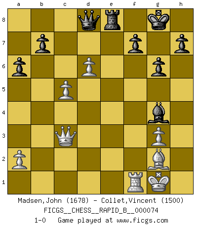 Last move : 1-0 2008 February 18 1:35:16 [Event "FICGS__CHESS__RAPID_B__000074"] [Site "FICGS"] [Date "2007.11.06"] [Round "1"] [White "Madsen,John"] [Black "Collet,Vincent"] [Result "1-0"] [WhiteElo "1678"] [BlackElo "1500"] 1.e4 c5 2.Nc3 Nc6 3.Nge2 Nf6 4.d4 cxd4 5.Nxd4 e5 6.Ndb5 d6 7.Nd5 Nxd5 8.exd5 Ne7 9.c4 Nf5 10.Bd3 Be7 11.O-O a6 12.Nc3 O-O 13.f4 exf4 14.Rxf4 g6 15.Kh1 Bf6 16.Rf1 Re8 17.Ne4 Be5 18.Bf4 Bxb2 19.g4 Rxe4 20.Bxe4 Qe7 21.Bf3 Bxa1 22.Qxa1 Ng7 23.Qc3 Qh4 24.Bg3 Qh3 25.Kg1 Bxg4 26.Bg2 Qh6 27.Bxd6 Re8 28.Bf4 Qh4 29.Bg3 Qd8 30.c5 Nh5 31.d6 Nxg3 32.hxg3 1-0 Sicilian : chameleon variation Kingside Castling by player White (move 11) Kingside Castling by player Black (move 12) Player White won this chess game. Follow this game move after move (download)It is not enough to be a good player... you must also play well. (Siegbert Tarrasch) Kritik überlasse ich den Spießern. Ich zeige nichts, wofür ich mich schämen muss. (Alexandra Kosteniuk) De eso se trata el Ajedrez. Un día le das una lección a tu oponente y al día siguiente el te da una a tí. (Bobby Fischer) Des points faibles ou des trous dans la position de l'adversaire doivent être occupés par des pièces et non pas par des pions. (Siegbert Tarrasch) Life is like a ten-speed bicycle: most of us have gears we never use. (Charles M. Schulz)