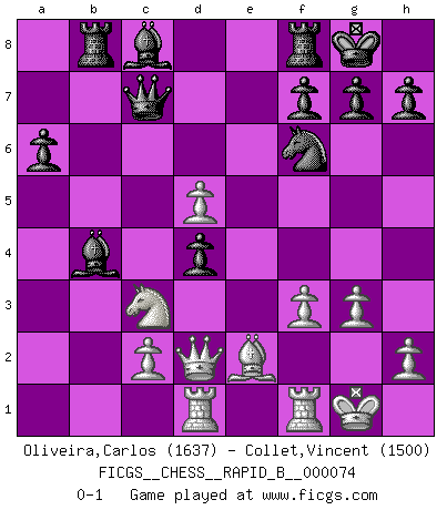Last move : 0-1 2008 January 23 5:49:39 [Event "FICGS__CHESS__RAPID_B__000074"] [Site "FICGS"] [Date "2007.11.06"] [Round "1"] [White "Oliveira,Carlos"] [Black "Collet,Vincent"] [Result "0-1"] [WhiteElo "1637"] [BlackElo "1500"] 1.e4 c5 2.Nf3 Nc6 3.d4 cxd4 4.Nxd4 e6 5.Nc3 Qc7 6.Be3 a6 7.Be2 Nf6 8.O-O Bb4 9.f3 O-O 10.Qd2 d5 11.Nxc6 bxc6 12.a3 Bd6 13.g3 Rb8 14.b4 c5 15.exd5 cxb4 16.axb4 Bxb4 17.Bd4 e5 18.Rad1 exd4 0-1 Sicilian defense Kingside Castling by player White (move 8) Kingside Castling by player Black (move 9) Player Black won this chess game. Follow this game move after move (download)The Chess pieces are the block alphabet which shapes thoughts; and these thoughts, although making a visual design on the chessboard, express their beauty abstractly, like a poem. (Marcel Duchamp) Ich bin der einzige Schachspieler, der sich während der Vorbereitungen zum Turnier verletzt hat. (Woody Allen) El Ajedrez es el juego mas altamente simbólico, pero las agresiones estan por lo tanto aún mas francamente representadas en la partida. Tal vez comenzo como un juego de guerra; Algo como la representación de una batalla en miniatura entre las fuerzas de dos reinos. (Karl Meninger) La guerre est enfant de la passion, la passion est enfant du narcissisme et le narcissisme est l'enfant. (...) Une autre partie ? (Thibault de Vassal) The human is the only animal species whose members are able to talk themselves into difficulties that would not otherwise exist. (Wendell Johnson)