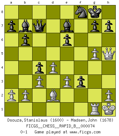 Last move : 0-1 2007 December 25 12:50:37 [Event "FICGS__CHESS__RAPID_B__000074"] [Site "FICGS"] [Date "2007.11.06"] [Round "1"] [White "Dsouza,Stanislaus"] [Black "Madsen,John"] [Result "0-1"] [WhiteElo "1600"] [BlackElo "1678"] 1.d4 Nf6 2.Nf3 e6 3.e3 Be7 4.Bd3 d5 5.Ne5 Nbd7 6.f4 c5 7.c3 Qc7 8.Nd2 b6 9.Ndf3 c4 10.Bc2 Bb7 11.O-O O-O 12.Ng5 Rae8 13.Nexf7 Rxf7 14.Nxf7 Kxf7 15.g4 Ne4 16.Bxe4 dxe4 17.g5 Rf8 18.Qh5+ Kg8 19.Kh1 Rf5 20.Rg1 Nf8 21.Bd2 Rxf4 22.Raf1 Rf3 23.Rxf3 exf3 0-1 Queen's pawn : Yusupov-Rubinstein system Kingside Castling by player White (move 11) Kingside Castling by player Black (move 11) Player Black won this chess game. Follow this game move after move (download)I'm not afraid of Spassky. The world knows I'm the best. You don't need a match to prove it. (Bobby Fischer) Ohne Fehler kann es keine Brillanz geben. (Emanuel Lasker) Bobby es el jugador de Ajedrez mas fino que este país jamás haya producido. Su memoria para las movidas, su brillantez en soñar combinaciones y su feróz determinación por la victoria son algo extraño. (John Collins) Assurément je connaissais par expérience le mystérieux attrait de ce jeu royal, le seul entre tous les jeux inventés par les hommes qui échappe souverainement à la tyrannie du hasard, le seul où l'on ne doive sa victoire qu'à son intelligence ou plutôt à une certaine forme d'intelligence. Mais n'est-ce pas déjà le limiter injurieusement que d'appeler les échecs un jeu ? N'est-ce pas une science, un art ou quelque chose qui, comme le cercueil de Mahomet entre ciel et terre, est suspendu entre l'un et l'autre, et qui réunit un nombre incroyable de contraires ? [...] C'est une pensée qui ne mène à rien, une mathématique qui n'établit rien, un art qui ne laisse pas d'uvre, une architecture sans matière; et il l'a prouvé néanmoins qu'il était plus durable, à sa manière, que les livres ou que tout autre monument, ce jeu unique qui appartient à tous les peuples et à tous les temps, et dont personne ne sait quel dieu en fit don à la terre pour tuer l'ennui, pour aiguiser l'esprit et stimuler l'âme. Où commence-t-il, où finit-il ? (Stefan Zweig) A journey of a thousand sites begins with a single click. (Author unknown)