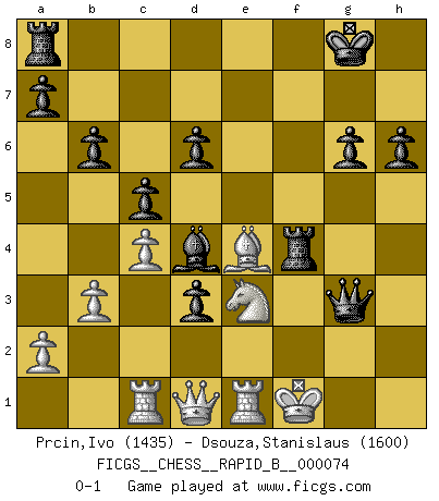 Last move : 0-1 2007 November 24 18:3:32 [Event "FICGS__CHESS__RAPID_B__000074"] [Site "FICGS"] [Date "2007.11.06"] [Round "1"] [White "Prcin,Ivo"] [Black "Dsouza,Stanislaus"] [Result "0-1"] [WhiteElo "1435"] [BlackElo "1600"] 1.d4 b6 2.Nf3 Bb7 3.g3 g6 4.Bg2 Bg7 5.c3 Nf6 6.O-O h6 7.Re1 O-O 8.Nbd2 d6 9.e4 Nbd7 10.d5 c5 11.b3 Ng4 12.Bb2 Nge5 13.Nf1 Nxf3+ 14.Bxf3 Ne5 15.Bg2 e6 16.c4 exd5 17.Bxe5 Bxe5 18.Rc1 d4 19.Nd2 f5 20.f3 f4 21.Kf2 fxg3+ 22.hxg3 d3 23.Nf1 Bd4+ 24.Ne3 Bxe4 25.Kf1 Qg5 26.f4 Qxg3 27.Bxe4 Rxf4+ 0-1 Queen's pawn : English defense Kingside Castling by player White (move 6) Kingside Castling by player Black (move 7) Player Black won this chess game. Follow this game move after move (download)Don't even mention losing to me. I can't stand to think of it. (Bobby Fischer) Wenn ich mich einlogge, glauben die Leute gewöhnlich nicht, dass ich es selbst bin und sie fangen an, mir dumme Fragen zu stellen. Und wenn sie es glauben, stellen sie wieder andere dumme Fragen. (Judith Polgar) El Ajedrez es de 30 a 40 por ciento psicología. Uno no cuenta con esto cuando se juega contra una computadora. No lo puedo confundir. (Judith Polgar) Le profane ne songe pas à la somme de jouissance dont il se prive, qui méconnaît ce jeu aux ressources aussi variées que passionnantes. (Jean-Marie Jeanton-Lamarche) He who defends everything defends nothing. (Frederick the Great)