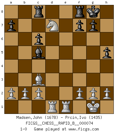 Last move : 1-0 2007 December 27 20:57:10 [Event "FICGS__CHESS__RAPID_B__000074"] [Site "FICGS"] [Date "2007.11.06"] [Round "1"] [White "Madsen,John"] [Black "Prcin,Ivo"] [Result "1-0"] [WhiteElo "1678"] [BlackElo "1435"] 1.e4 e6 2.d4 d5 3.Nc3 Bb4 4.Bd2 c5 5.dxc5 Bxc5 6.Nf3 Ne7 7.Bb5+ Nbc6 8.O-O Bd7 9.exd5 Nxd5 10.Nxd5 exd5 11.Bc3 O-O 12.Qxd5 Ne7 13.Qxd7 Qxd7 14.Bxd7 Rad8 15.Rad1 h5 16.Rfe1 Nc6 17.Bxc6 bxc6 18.Ne5 Rc8 19.Nd7 1-0 French : Winawer, fingerslip variation Kingside Castling by player White (move 8) Kingside Castling by player Black (move 11) Player White won this chess game. Follow this game move after move (download)Winning isn't everything... but losing is nothing. (Mednis) Dass jemand wie Surab Asmaiparaschwili, der selbst Elopunkte gekauft hat , Vize-Präsident der Fide werden konnte, sagt schon einges über den Zustand dieser Organisation aus. (Joel Lautier) Vive, pierde y aprende al observar a tu oponente como gana. (Amber Steenbock) Psychologiquement, tu dois avoir confiance en toi même, mais cette confiance doit être basée sur des faits. (Robert Fischer) Thus, what is of supreme importance in war is to attack the enemy's strategy. (Sun Tzu)