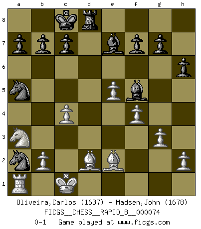 Last move : 0-1 2008 January 24 16:42:23 [Event "FICGS__CHESS__RAPID_B__000074"] [Site "FICGS"] [Date "2007.11.06"] [Round "1"] [White "Oliveira,Carlos"] [Black "Madsen,John"] [Result "0-1"] [WhiteElo "1637"] [BlackElo "1678"] 1.e4 d5 2.exd5 Nf6 3.d4 Nxd5 4.c4 Nb4 5.Be3 e5 6.dxe5 Qxd1+ 7.Kxd1 Bf5 8.Na3 N8c6 9.Nf3 O-O-O 10.Kc1 h6 11.Be2 Be7 12.Rd1 Rhe8 13.Rxd8+ Rxd8 14.Nh4 Bxh4 15.g3 Be7 16.f4 Na5 17.Bd2 Nxa2+ 0-1 Scandinavian : Kiel variation Queenside Castling by player Black (move 9) Player Black won this chess game. Follow this game move after move (download)Tactics flow from a superior position. (Bobby Fischer) Kasparov stellt für gewöhnlich die Regeln auf und bricht sie dann selbst wieder. (Alexej Shirov) La captura del Rey enemigo es la finalidad pero no el primer objetivo de la partida. (William Steinitz) Il vaut toujours mieux jouer un plan faux de façon logique que de n'avoir pas de plan du tout. (Victor Kortchnoï) If I had no sense of humor, I would long ago have committed suicide. (Mahatma Gandhi)