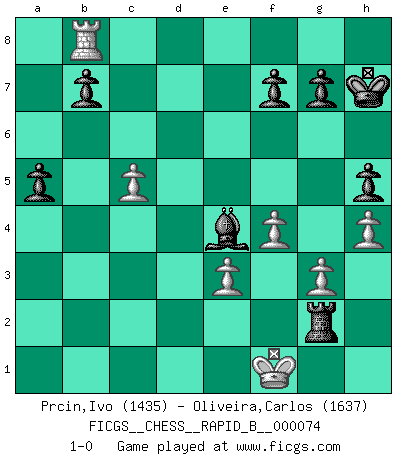 Last move : 1-0 2008 February 23 14:21:15 [Event "FICGS__CHESS__RAPID_B__000074"] [Site "FICGS"] [Date "2007.11.06"] [Round "1"] [White "Prcin,Ivo"] [Black "Oliveira,Carlos"] [Result "1-0"] [WhiteElo "1435"] [BlackElo "1637"] 1.d4 d5 2.c4 e6 3.Nf3 c6 4.Nc3 Nf6 5.Bg5 dxc4 6.a4 Bb4 7.e3 Qa5 8.Qc2 Ne4 9.Rc1 Bxc3+ 10.bxc3 Nxg5 11.Nxg5 Qxg5 12.g3 O-O 13.Bxc4 Nd7 14.O-O e5 15.d5 cxd5 16.Bxd5 Nf6 17.Bg2 e4 18.Bxe4 Bh3 19.Rfe1 Nxe4 20.Qxe4 Rab8 21.c4 Rfe8 22.Qd3 Qg4 23.Qe2 Qxe2 24.Rxe2 Rbd8 25.f4 Bf5 26.R2e1 Rd2 27.c5 Ra2 28.Rc4 Re4 29.Rec1 Rxa4 30.Rd1 h5 31.Rxa4 Rxa4 32.Rd8+ Kh7 33.Rb8 Be4 34.Kf2 Ra2+ 35.Kg1 a5 36.h4 Rg2+ 37.Kf1 1-0 This chess game has been lost on time (started : 2007.11.06 15:59:42) Queen's gambit declined Kingside Castling by player Black (move 12) Kingside Castling by player White (move 14) Player White won this chess game. Follow this game move after move (download)Who is your opponent tonight, tonight I am playing against the Black pieces. (Akiba Rubinstein) Ein Schachspiel besteht aus drei Phasen: Die erste, wenn du hofftst den Vorteil zu haben, die zweite, wenn du glaubst einen Vorteil zu haben, und die dritte.... wenn du weißt Du wirst verlieren. (Savielly Grigorievitsch Tartakower) En el Ajedrez, tal como en la vida, las bendiciones de hoy pueden ser el veneno del mañana. (Assaic) Vouloir jouer aux échecs contre soi-même est aussi paradoxal que vouloir marcher sur son ombre. (Stefan Zweig) The meaning of life is that it is to be lived, and it is not to be traded and conceptualized and squeezed into a pattern of systems. (Bruce Lee)
