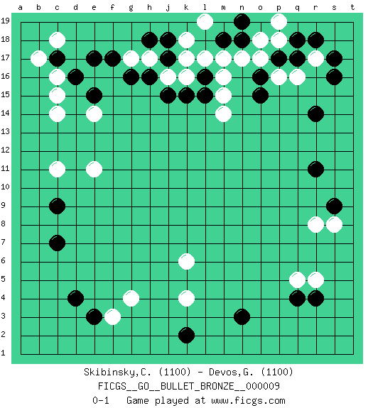 Last move : 0-1 2007 November 7 6:51:15 [Event "FICGS__GO__BULLET_BRONZE__000009 "] [Site "FICGS"] [Date "2007.11.06"] [Round "1"] [Black "Skibinsky,Clayten "] [White "Devos,Guillaume "] [Result "0-1"] [Rating 1 "1100"] [Rating 2 "1100"] 1.d4 q16 2.q4 c16 3.e17 g17 4.e15 c14 5.g16 h17 6.h16 j16 7.j15 k16 8.k15 m16 9.l16 l17 10.l15 n17 11.r14 r8 12.f17 k4 13.s16 r17 14.r11 r5 15.r4 q5 16.n3 g4 17.e3 f3 18.k2 k6 19.c7 c11 20.c17 b17 21.d16 c15 22.c9 e11 23.j17 k17 24.j18 k18 25.h18 e14 26.s9 s8 27.s17 c18 28.p17 p16 29.r18 o17 30.m18 m17 31.q18 p18 32.q17 p19 33.n18 o18 34.o15 l19 35.n19 m15 36.o16 m14 0-1 This go game has been lost on time (started : 2007.11.06 22:58:13) Comment by player 2 : Guillaume Devos :Clayten, did you stop playing? Greetings! Here are the names of the openings (joseki) played in the four corners : Corner d16 : c16 e17Komoku (Somok, Xiao~mu`) 3-4 Point. The komoku (3-4) point is the traditional corner enclosure move..Ikken Kakari (Hankan Keolch'im, Yi Gua`jiao~, 1-Space Low Pincer). The small knight move is the basic approach move to the 3-4 point stone. It has been continually used for over four centuries. There are limitless variations, with new moves constantly being discovered. Black 2 opens the door to a treaure store of joseki. Corner q4 : q4 r8Hoshi (Hwajeom, Seongjeom, Xingwei`) 4-4 Point. The star or hoshi (4-4) point, emphasizing influence at the potential expense of territory. Corner d4 : d4 g4Hoshi (Hwajeom, Seongjeom, Xingwei`) 4-4 Point. The star or hoshi (4-4) point, emphasizing influence at the potential expense of territory.Niken Takagakari (Dukan Nop'dakeolch'im, E`r Gaojia, 2-Space High Approach). White 2 is a light approach move. Rarely played in even games, White 2 is typically employed in handicap games. Black continues with 6-4 or 3-10. In Korean Sunjang Baduk Black has a stone on 8-4. Player White won this Go (weiqi, baduk) game.Follow this game move after move (download ) Strange things happen at the one-two points. (Anonymous) The problem with troubleshooting is that trouble shoots back. (Anonymous)