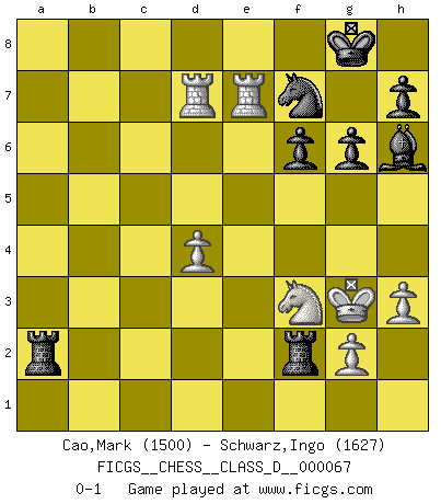 Last move : 0-1 2008 July 10 14:47:39 [Event "FICGS__CHESS__CLASS_D__000067"] [Site "FICGS"] [Date "2007.11.07"] [Round "1"] [White "Cao,Mark"] [Black "Schwarz,Ingo"] [Result "0-1"] [WhiteElo "1500"] [BlackElo "1627"] 1.d4 g6 2.e4 Bg7 3.Nf3 f6 4.Nc3 Nh6 5.Bc4 Nf7 6.O-O O-O 7.Be3 c6 8.Qd2 d6 9.Bb3 Na6 10.Rad1 Nc7 11.h3 Bd7 12.Rfe1 b5 13.Bh6 Bxh6 14.Qe2 b4 15.Nb1 a5 16.c3 d5 17.exd5 Nxd5 18.Bxd5 cxd5 19.cxb4 axb4 20.Qxe7 Qxe7 21.Rxe7 Bf5 22.a3 Bxb1 23.Rxb1 bxa3 24.bxa3 Rxa3 25.Rb5 Rc8 26.Rxd5 Rc1+ 27.Kh2 Ra2 28.Kg3 Rf1 29.R5d7 R1xf2 0-1 This chess game has been lost on time (started : 2007.11.07 12:58:44) Modern defense Kingside Castling by player White (move 6) Kingside Castling by player Black (move 6) Player Black won this chess game. Follow this game move after move (download)By this measure (on the gap between Fischer & his contemporaries), I consider him the greatest world champion. (Garry Kasparov) Stelle das Brett so, daß die Sonne in die Augen deines Gegners scheint. (Ruy López) Yo siempre he tenido un ligero sentimiento de lástima por una persona que no tiene conocimiento del Ajedrez. (Siegbert Tarrasch) Je crois qu'il existe des manières très spécifiques de jouer efficacement contre une machine. Evidemment, nous n'avons aucune chance en technique pure, parce que l'ordinateur calcule de manière parfaite. Mais lorsque nous faisons appel à notre cerveau, en utilisant l'intuition et la compréhension, alors nous restons beaucoup plus forts. (Anatoli Karpov) For peace of mind, resign as general manager of the universe. (Douglas Adams)