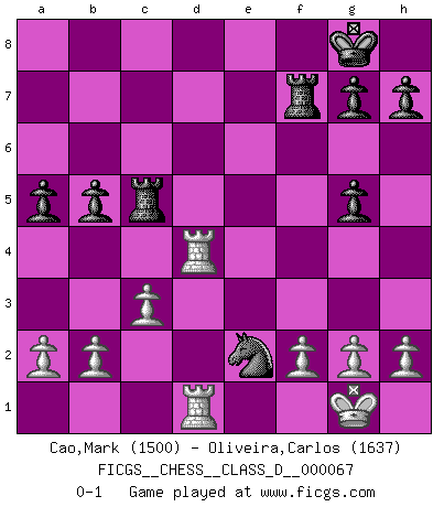 Last move : 0-1 2008 January 17 3:38:20 [Event "FICGS__CHESS__CLASS_D__000067"] [Site "FICGS"] [Date "2007.11.07"] [Round "1"] [White "Cao,Mark"] [Black "Oliveira,Carlos"] [Result "0-1"] [WhiteElo "1500"] [BlackElo "1637"] 1.e4 c6 2.d4 d5 3.Nc3 dxe4 4.Nxe4 Nd7 5.Nf3 Ngf6 6.Nxf6+ Nxf6 7.Be2 Bf5 8.c3 e6 9.Be3 Be7 10.O-O O-O 11.Ne5 Nd5 12.Bc1 c5 13.Bc4 a6 14.dxc5 Bxc5 15.Qf3 b5 16.Bb3 Rc8 17.Qg3 Qf6 18.Bg5 Qxg5 19.Qxg5 f6 20.Nd7 fxg5 21.Nxc5 Rxc5 22.Rad1 Bg6 23.Rfe1 a5 24.Rxe6 Bf7 25.Rd6 Nf4 26.Bxf7+ Rxf7 27.R6d4 Ne2+ 0-1 Caro-Kann : Steinitz variation Kingside Castling by player White (move 10) Kingside Castling by player Black (move 10) Player Black won this chess game. Follow this game move after move (download)The way he plays Chess demonstrates a man's whole nature. (Stanley Ellin) Konzentriere dich auf materielle Gewinne. Nimm, was dir dein Gegner gibt, ausser es gibt einen guten Grund der dagegenspricht. (Robert James Fischer) Morphy probablemente fue el genio más grande de todos. (Bobby Fischer) Le succès, c'est être capable d'aller d'échec en échec sans perdre son enthousiasme. (Winston Churchill) I take risks, sometimes patients die, but not taking risks causes more patients to die. So I guess my biggest problem is I've been cursed with the ability to do the math. (Gregory House, House M.D.)