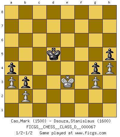 Last move : 1/2-1/2 2007 December 25 20:40:25 [Event "FICGS__CHESS__CLASS_D__000067"] [Site "FICGS"] [Date "2007.11.07"] [Round "1"] [White "Cao,Mark"] [Black "Dsouza,Stanislaus"] [Result "1/2-1/2"] [WhiteElo "1500"] [BlackElo "1600"] 1.d4 b6 2.e4 Bb7 3.Nc3 g6 4.Nf3 Bg7 5.Bd3 e6 6.Be3 Nf6 7.O-O O-O 8.Qd2 d6 9.Ne2 Nxe4 10.Bxe4 Bxe4 11.Ng5 Bb7 12.c3 Nd7 13.Ng3 c5 14.Rad1 d5 15.Nf3 c4 16.Bh6 b5 17.Rfe1 a5 18.Bxg7 Kxg7 19.Ne5 Nxe5 20.Rxe5 Qd6 21.Rde1 b4 22.Ne2 f6 23.Re3 b3 24.a3 e5 25.Rf3 h5 26.Re3 g5 27.Ng3 Kg6 28.dxe5 Qc6 29.exf6 Rxf6 30.Qd4 Raf8 31.f3 Bc8 32.Re5 Rf4 33.Qxd5 Qxd5 34.Rxd5 a4 35.Rd6+ R4f6 36.Rxf6+ Rxf6 37.Ne4 Rc6 38.Rd1 Bf5 39.Rd8 Bxe4 40.fxe4 Re6 41.Rd4 Rc6 42.Kf2 Kf6 43.h3 Ke5 44.Kf3 Rf6+ 45.Ke2 Rf4 46.Rxc4 Rxe4+ 47.Rxe4+ Kxe4 48.c4 Kd4 49.c5 Kxc5 50.Kd3 Kd5 51.g3 g4 52.h4 Ke5 53.Ke3 Kd5 54.Kd3 Ke5 55.Ke3 Kd5 1/2-1/2 Queen's pawn : English defense Kingside Castling by player White (move 7) Kingside Castling by player Black (move 7) 10 pieces endgame at move 49 : White KPPPP , Black KPPPP WHITE : King + 4 Pawns BLACK : King + 4 Pawns This chess game ended in a draw. Follow this game move after move (download)Robert Fischer is a law unto himself. (Larry Evans) Wenn Schach ein enormer Dschungel ist, der seine Myriaden von Geheimnissen nicht preisgeben will, dann sind Computer die Kettensägen einer gewaltigen ökologisch unsensiblen Nutzholzfirma. (Nigel Short) Antes de los Finales, los dioses han colocado el Juego Medio. (Siegbert Tarrasch) Fischer est le meilleur joueur du monde et Karpov n'est qu'un joueur de bistrot. (Garry Kasparov, agé de 16 ans) There is a great deal of difference between an eager man who wants to read a book and a tired man who wants a book to read. (G.K. Chesterton)