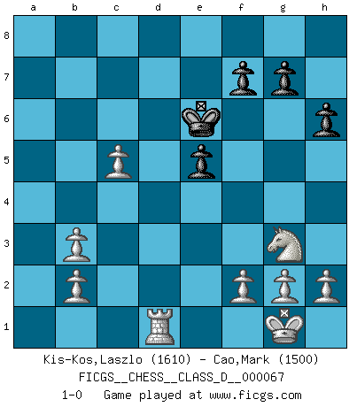 Last move : 1-0 2007 December 7 2:7:10 [Event "FICGS__CHESS__CLASS_D__000067"] [Site "FICGS"] [Date "2007.11.07"] [Round "1"] [White "Kis-Kos,Laszlo"] [Black "Cao,Mark"] [Result "1-0"] [WhiteElo "1610"] [BlackElo "1500"] 1.e4 e5 2.Nf3 Nc6 3.Bb5 a6 4.Ba4 Nf6 5.O-O b5 6.Bb3 h6 7.Nc3 Bc5 8.Nxe5 Nxe5 9.d4 Bxd4 10.Qxd4 d6 11.Rd1 O-O 12.Bf4 Re8 13.Bxe5 Rxe5 14.Qxe5 dxe5 15.Rxd8+ Kh7 16.Nd5 Bb7 17.Rxa8 Bxa8 18.Nxc7 Bxe4 19.Nxa6 Bd5 20.Re1 Bxb3 21.axb3 Nd7 22.Nc7 Kg6 23.Rd1 Nf6 24.Nxb5 Ne4 25.c4 Kf5 26.Nd6+ Ke6 27.Nxe4 Kf5 28.Ng3+ Ke6 29.c5 1-0 Ruy Lopez : 5.O-O Kingside Castling by player White (move 5) Kingside Castling by player Black (move 11) Player White won this chess game. Follow this game move after move (download)A good sacrifice is one that is not necessarily sound but leaves your opponent dazed and confused. (Rudolph Spielmann) Ich würde mich als ganz normalen Jungen bezeichnen [Im Alter von 12]. (Sergej Karjakin) Alguna parte de un error es siempre correcto. (Savielly Tartakover) J'apprécie les joueurs d'est-indienne, c'est grâce à eux que je nourris ma famille depuis tant d'années. (Petrosian) To be champion requires more than simply being a strong player; one has to be a strong human being as well. (Anatoly Karpov)