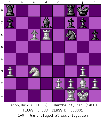 Last move : 1-0 2006 May 31 15:15:31 [Event "FICGS__CHESS__CLASS_D__000001"] [Site "FICGS"] [Date "2006.04.12"] [Round "1"] [White "Baron,Ovidiu"] [Black "Berthelot,Eric"] [Result "1-0"] [WhiteElo "1626"] [BlackElo "1420"] 1.g3 e5 2.Bg2 Nf6 3.c4 c6 4.Nc3 Bb4 5.a3 Ba5 6.b4 Bc7 7.d4 exd4 8.Qxd4 d6 9.Bg5 Nbd7 10.Nf3 O-O 11.O-O h6 12.Bf4 Nb6 13.Rad1 Be6 14.c5 dxc5 15.Qxc5 Qc8 16.Bxc7 Qxc7 17.Nd4 Bd7 18.Ndb5 Qc8 19.Nd6 Qd8 20.Nxb7 Qc8 21.Nd6 Qc7 22.b5 Nc8 23.bxc6 Nxd6 24.Qxd6 Qxd6 25.Rxd6 1-0 Benko's Opening Kingside Castling by player Black (move 10) Kingside Castling by player White (move 11) Player White won this chess game. Follow this game move after move (download)If a ruler does not understand Chess, how can he rule over a kingdom ? (King Khusros II) Mein Name ist Rustam Kamsky. Sie haben meinen Sohn belästigt. Bereiten Sie sich aufs Sterben vor. (Rustam Kamsky) La batalla por la última verdad nunca sera ganada. Y es por eso que el Ajedrez es tan fascinante. (Hans Kmoch) Aux échecs, les retours au sommet sont rares : les dommages psychologiques consécutifs à une défaite sont trop sévères. (Daily Telegraph) Memory is a crazy woman that hoards colored rags and throws away food. (Austin O'Malley)