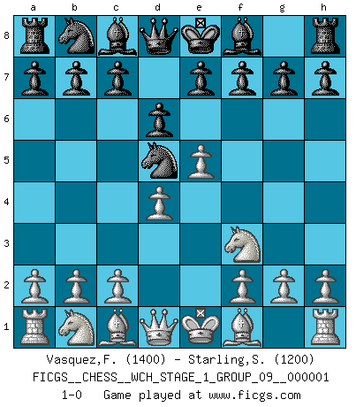 Last move : 1-0 2006 August 11 17:21:28 [Event "FICGS__CHESS__WCH_STAGE_1_GROUP_09__000001"] [Site "FICGS"] [Date "2006.07.01"] [Round "1"] [White "Vasquez,Fernando"] [Black "Starling,Stephen"] [Result "1-0"] [WhiteElo "1400"] [BlackElo "1200"] 1.e4 Nf6 2.e5 Nd5 3.d4 d6 4.Nf3 1-0 This chess game has been lost on time (started : 2006.07.01 16:11:36) Alekhine's defense : Modern variation Player White won this chess game. Follow this game move after move (download)When the Chess game is over, the Pawn and the King go back to the same box. (Irish saying) Vielleicht wirkt die Aura früherer Spieler glanzvoller als die der heutigen Spieler, aber das liegt daran, dass man kein Programm wie Fritz hatte, das einem all die Löcher in ihren Partien zeigt. (Vladimir Kramnik) Puntos débiles o agujeros en la posición de tu oponente deben de ser ocupados por piezas, no Peones. (Siegbert Tarrasch) Mais n'est-ce pas déjà le limiter injurieusement que d'appeler les échecs un jeu? N'est-ce pas aussi une science, un art, ou quelque chose qui, comme le cercueil de Mahomet entre ciel et terre, est suspendu entre l'un et l'autre, et qui réunit un nombre incroyable de contraires ? (Stefan Zweig) A computer lets you make more mistakes faster than any invention in human history - with the possible exceptions of handguns and tequila. (Mitch Ratcliffe)