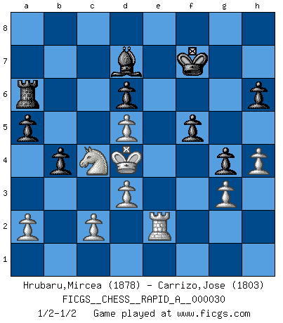 Last move : 1/2-1/2 2008 March 13 22:47:33 [Event "FICGS__CHESS__RAPID_A__000030"] [Site "FICGS"] [Date "2007.11.08"] [Round "1"] [White "Hrubaru,Mircea"] [Black "Carrizo,Jose"] [Result "1/2-1/2"] [WhiteElo "1878"] [BlackElo "1803"] 1.e4 e5 2.Nc3 Nf6 3.f4 d5 4.fxe5 Nxe4 5.Qf3 f5 6.d3 Nxc3 7.bxc3 d4 8.Qg3 Nc6 9.Be2 Qd5 10.Bf3 Qxe5+ 11.Qxe5+ Nxe5 12.cxd4 Nxf3+ 13.Nxf3 Bd6 14.Kf2 O-O 15.Re1 Bd7 16.g3 Rae8 17.Bf4 h6 18.Be5 g5 19.h4 g4 20.Bxd6 cxd6 21.Rxe8 Rxe8 22.Nd2 b5 23.Rb1 Kf7 24.Nf1 a5 25.Ne3 b4 26.Nc4 Ke6 27.Rb2 Ra8 28.d5+ Ke7 29.Rb1 Ra6 30.Ke3 Bb5 31.Re1 Bd7 32.Kd4 Kf6 33.Re2 Kf7 1/2-1/2 Vienna gambit : Bardeleben variation Kingside Castling by player Black (move 14) This chess game ended in a draw. Follow this game move after move (download)First-class players lose to second-class players because second-class players sometimes play a first-class game. (Siegbert Tarrasch) Die Fehler sind da, Sie warten nur darauf gemacht zu werden. (Savielly Grigorievitsch Tartakower) En el Ajedrez, cuando menos, el valiente hereda la tierra. (Edmar Mednis) Ce n'est pas pour s'amuser qu'il joue aux échecs : il célèbre un culte. (Vladimir Nabokov) A shortcut is the longest distance between two points. (Don Groves)