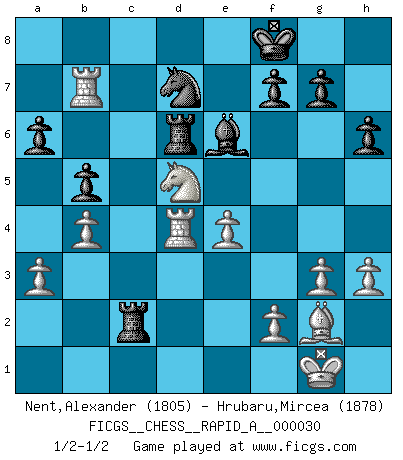 Last move : 1/2-1/2 2008 February 29 15:20:55 [Event "FICGS__CHESS__RAPID_A__000030"] [Site "FICGS"] [Date "2007.11.08"] [Round "1"] [White "Nent,Alexander"] [Black "Hrubaru,Mircea"] [Result "1/2-1/2"] [WhiteElo "1805"] [BlackElo "1878"] 1.d4 Nf6 2.c4 e6 3.Nc3 Bb4 4.Qc2 c5 5.dxc5 Qc7 6.Nf3 Bxc5 7.g3 a6 8.Bf4 d6 9.Bg2 h6 10.Rc1 Nc6 11.O-O O-O 12.a3 Qe7 13.b4 Ba7 14.Qd2 Rd8 15.Be3 d5 16.Bxa7 Rxa7 17.cxd5 exd5 18.Nd4 Be6 19.Rfd1 R7a8 20.Na4 Rac8 21.Nb6 Rc7 22.Qf4 Nh5 23.Nxc6 Rxc6 24.Qd4 Rcd6 25.Rc3 Qf6 26.Na4 Qxd4 27.Rxd4 Nf6 28.h3 b6 29.Rc7 Kf8 30.Rb7 Nd7 31.e4 b5 32.Nc3 Rc8 33.Nxd5 Rc1+ 34.Kh2 Rc2 35.Kg1 1/2-1/2 Nimzo-Indian : Classical, 4...c5 Kingside Castling by player White (move 11) Kingside Castling by player Black (move 11) This chess game ended in a draw. Follow this game move after move (download)The passed pawn is a criminal, who should be kept under lock and key. Mild measures, such as police surveillance, are not sufficient. (Nimzovitch) Smyslow ist ein Beweis dafür, dass ich noch zehn Jahre spielen kann! [der 75 jährige über den 85 jährigen] (Viktor Kortschnoi) Fischer sacrificó virtualmente todo lo que la mayoría de nosotros los 'debiles' (término que él usa) valoramos, respetamos y apreciamos por el amor de un astuto, a menudo hermoso tablero de juego, por el privilegio ambivalente de ser su mas grande maestro. (Paul Kollar) Fischer est le meilleur joueur du monde et Karpov n'est qu'un joueur de bistrot. (Garry Kasparov, agé de 16 ans) Beep ! (R2D2 in Star Wars ep.3)