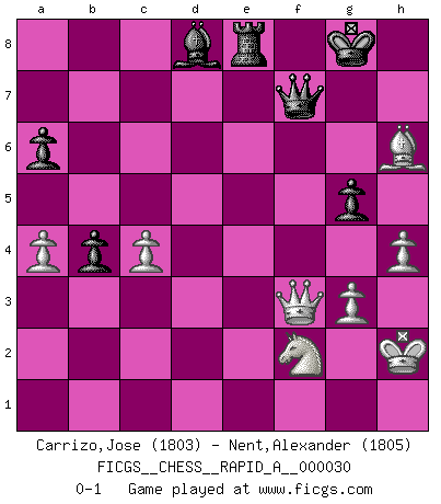 Last move : 0-1 2008 February 29 13:53:8 [Event "FICGS__CHESS__RAPID_A__000030"] [Site "FICGS"] [Date "2007.11.08"] [Round "1"] [White "Carrizo,Jose"] [Black "Nent,Alexander"] [Result "0-1"] [WhiteElo "1803"] [BlackElo "1805"] 1.e4 e5 2.Nf3 Nc6 3.Bb5 a6 4.Ba4 Nf6 5.O-O Be7 6.Re1 b5 7.Bb3 d6 8.c3 O-O 9.d4 Bg4 10.d5 Na5 11.Bc2 c6 12.h3 Bc8 13.dxc6 Qc7 14.Nbd2 Qxc6 15.Nf1 Nc4 16.Ng3 Re8 17.a4 Be6 18.Nh4 g6 19.Nf3 Rac8 20.Ng5 b4 21.b3 Na3 22.c4 Nxc2 23.Qxc2 d5 24.exd5 Bxd5 25.f3 Qc7 26.Be3 Bb7 27.Qd2 Nd7 28.N3e4 Red8 29.Nf2 h6 30.Nxf7 Kxf7 31.Bxh6 Nc5 32.Qc2 Bh4 33.Re3 Rd4 34.Ng4 Re8 35.Qe2 e4 36.Rf1 Kg8 37.fxe4 Bxe4 38.g3 Bd8 39.Ref3 g5 40.Kh2 Nxb3 41.Rxb3 Qd7 42.Rf2 Rd1 43.Rbf3 Bxf3 44.Qxf3 Rd2 45.h4 Rxf2+ 46.Nxf2 Qf7 0-1 Ruy Lopez : Closed Kingside Castling by player White (move 5) Kingside Castling by player Black (move 8) Player Black won this chess game. Follow this game move after move (download)You know, comrade Pachman, I don't enjoy being a Minister, I would rather play Chess like you. (Che Guevara) Das Zentrum ist der Balkan des Schachbretts - Kriegshandlungen können in jedem Moment ausbrechen. (Aaron Nimzowitsch) El Ajedrez es un expediente tonto que hace creer a la gente inactiva que hacen una cosa muy astuta cuando solamente estan perdiendo su tiempo. (George Bernard Shaw) Vous m'avez demandé de vous exposer quel est le fondement de la prière. Je ne fais que préparer les pièces du jeu sur la table... Nous sera-t-il permis d'en adopter les règles et si nous les appliquons scrupuleusement nous ne tarderons pas à faire mat le Roi divin ! Il ne pourra échapper à nos mains. (Sainte Thérèse d'Avila, Chemin de perfection) Now you put water in a cup, it becomes the cup; You put water into a bottle it becomes the bottle; You put it in a teapot it becomes the teapot. Water can flow or it can crash. Be water, my friend. (Bruce Lee)