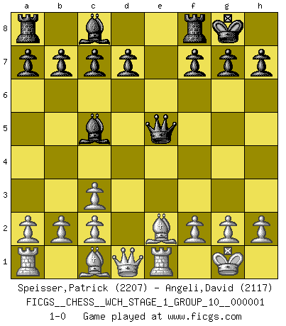 Last move : 1-0 2006 August 14 17:38:4 [Event "FICGS__CHESS__WCH_STAGE_1_GROUP_10__000001"] [Site "FICGS"] [Date "2006.07.01"] [Round "1"] [White "Speisser,Patrick"] [Black "Angeli,David"] [Result "1-0"] [WhiteElo "2207"] [BlackElo "2117"] 1.e4 e5 2.Nf3 Nc6 3.Nc3 Nf6 4.Bb5 Nd4 5.Nxd4 exd4 6.e5 dxc3 7.exf6 Qxf6 8.dxc3 Qe5+ 9.Be2 Bc5 10.O-O O-O 11.Re1 1-0 This chess game has been lost on time (started : 2006.07.01 16:12:39) Four knights : Rubinstein counter-gambit, Exchange variation Kingside Castling by player White (move 10) Kingside Castling by player Black (move 10) Player White won this chess game. Follow this game move after move (download)You cannot play at Chess if you are kind-hearted. (French Proverb) Ein Springer auf f6 gegen die eigene Rochadestellung ist schlimmer als ein rostiger Nagel im Knie. (Efim Bogoljubov) El Ajedrez es de 30 a 40 por ciento psicología. Uno no cuenta con esto cuando se juega contra una computadora. No lo puedo confundir. (Judith Polgar) Que feriez-vous si vous étiez en train de jouer aux échecs et que la fin du monde arrive ? Je continuerais à jouer. (Saint Borromée) Do not put your faith in what statistics say until you have carefully considered what they do not say. (William W. Watt)