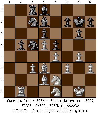 Last move : 1/2-1/2 2008 February 7 13:32:55 [Event "FICGS__CHESS__RAPID_A__000030"] [Site "FICGS"] [Date "2007.11.08"] [Round "1"] [White "Carrizo,Jose"] [Black "Riccio,Domenico"] [Result "1/2-1/2"] [WhiteElo "1803"] [BlackElo "1800"] 1.e4 e5 2.Nf3 Nc6 3.Bb5 a6 4.Ba4 Nf6 5.O-O Be7 6.Re1 b5 7.Bb3 O-O 8.c3 d6 9.d4 Bg4 10.d5 Na5 11.Bc2 c5 12.Nbd2 Bd7 13.Nf1 Qc7 14.Ng3 Nc4 15.b3 Nb6 16.Nh4 g6 17.Nf3 a5 18.Bg5 Rfc8 19.h3 c4 20.Bd2 cxb3 21.axb3 a4 22.Qe2 axb3 23.Bxb3 Na4 24.Qe3 Qb6 25.Qh6 Nb2 26.Rxa8 Rxa8 27.Rb1 Nd3 28.Qe3 Qxe3 29.Bxe3 Rc8 30.Bd2 Kg7 31.Ne1 Nc5 32.Bc2 Bd8 33.f3 Na4 34.Ne2 Ne8 35.Bd3 Nc7 36.g4 Nc5 1/2-1/2 Ruy Lopez : Closed, 7...O-O Kingside Castling by player White (move 5) Kingside Castling by player Black (move 7) This chess game ended in a draw. Follow this game move after move (download)In the perfect Chess combination as in a first-rate short story, the whole plot and counter-plot should lead up to a striking finale, the interest not being allayed until the very last moment. (Yates and Winter) Frage: Wie viele Autos haben Sie schon zerstört? - Antwort: Nur zwei. (Loek van Wely) De todos mis libros Rusos, la defensa contiene y difunde el 'calor' mas grande que pudiese verse extraño al observar lo supremamente abstracto que el Ajedrez supuestamente es. (Vladimir Nabokov) Un journaliste : 'Vous préférez avoir une dame de plus sur l'échiquier ou au lit ?' Boris Spassky : 'Ca dépend de la position.' All the troubles of the world come from being unable to sit alone in a quiet room. (Blaise Pascal)