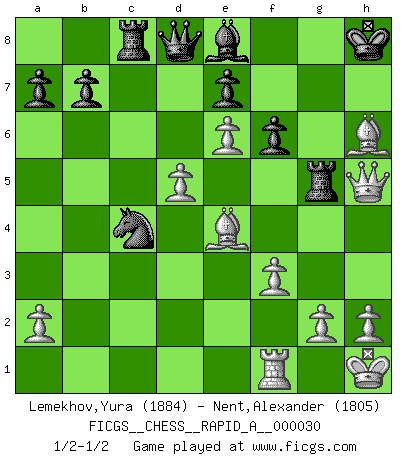 Last move : 1/2-1/2 2007 December 9 15:1:14 [Event "FICGS__CHESS__RAPID_A__000030"] [Site "FICGS"] [Date "2007.11.08"] [Round "1"] [White "Lemekhov,Yura"] [Black "Nent,Alexander"] [Result "1/2-1/2"] [WhiteElo "1884"] [BlackElo "1805"] 1.d4 Nf6 2.c4 g6 3.Nc3 d5 4.cxd5 Nxd5 5.e4 Nxc3 6.bxc3 Bg7 7.Bc4 c5 8.Ne2 Nc6 9.Be3 O-O 10.O-O Bg4 11.f3 Na5 12.Bd3 cxd4 13.cxd4 Be6 14.d5 Bxa1 15.Qxa1 f6 16.Bh6 Re8 17.Kh1 Rc8 18.Nf4 Bd7 19.e5 Nc4 20.e6 Ba4 21.Nxg6 hxg6 22.Bxg6 Kh8 23.Qe1 Rg8 24.Be4 Be8 25.Qh4 Rg6 26.Qh5 Rg5 1/2-1/2 King's Indian defense, 3.Nc3 Kingside Castling by player Black (move 9) Kingside Castling by player White (move 10) This chess game ended in a draw. Follow this game move after move (download)When you play Bobby, it is not a question if you win or lose. It is a question if you survive. (Boris Spassky) Mutter, ich bin eben Ex-Weltmeister geworden. --beim nach Hause Kommen nach dem Verlust des WM-Titels an Mihail Botvinnik -- (Mikhail Nekhemyevich Tal) En el Ajedrez, cuando menos, el valiente hereda la tierra. (Edmar Mednis) Psychologiquement, tu dois avoir confiance en toi même, mais cette confiance doit être basée sur des faits. (Robert Fischer) Ah, beer! The cause of, and the solution to, all of life's problems. (Homer Simpson)