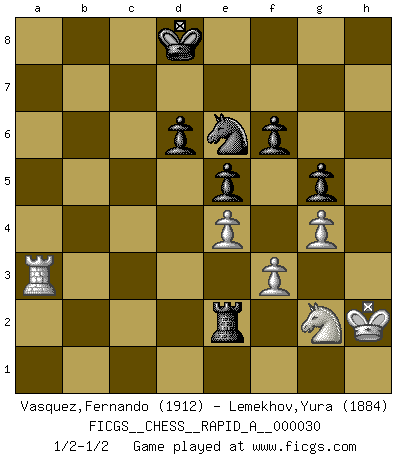 Last move : 1/2-1/2 2008 March 12 1:52:46 [Event "FICGS__CHESS__RAPID_A__000030"] [Site "FICGS"] [Date "2007.11.08"] [Round "1"] [White "Vasquez,Fernando"] [Black "Lemekhov,Yura"] [Result "1/2-1/2"] [WhiteElo "1912"] [BlackElo "1884"] 1.e4 c5 2.d4 cxd4 3.c3 dxc3 4.Nxc3 Nc6 5.Nf3 e6 6.Bc4 d6 7.O-O Be7 8.Qe2 Nf6 9.Rd1 e5 10.Bb5 Bd7 11.Bg5 a6 12.Ba4 b5 13.Bb3 Bg4 14.Be3 O-O 15.a4 Bd7 16.axb5 axb5 17.h3 Rxa1 18.Rxa1 h6 19.Kh2 Qc7 20.Nd5 Nxd5 21.Bxd5 Nb4 22.Ra7 Qc8 23.Bb7 Qd8 24.Qd2 Nc6 25.Ra6 Qc7 26.Ba8 Rb8 27.Qc3 Rc8 28.Bd2 Kf8 29.Be3 Ke8 30.Ne1 Nd4 31.Qd2 Nb3 32.Qd1 Nc5 33.Ra3 Bc6 34.Bxc6+ Qxc6 35.f3 Na4 36.Rb3 f6 37.g3 Qc4 38.Ng2 b4 39.Bd2 Qc2 40.Qxc2 Rxc2 41.Bxb4 Nxb2 42.h4 g5 43.hxg5 hxg5 44.Kh3 Nc4 45.g4 Kd7 46.Ne1 Re2 47.Ng2 Kc6 48.Rb1 Nb2 49.Rc1+ Kd7 50.Ba5 Bd8 51.Bxd8 Kxd8 52.Rc3 Na4 53.Ra3 Nc5 54.Kh2 Ne6 1/2-1/2 Sicilian : Smith-Morra gambit Kingside Castling by player White (move 7) Kingside Castling by player Black (move 14) This chess game ended in a draw. Follow this game move after move (download)Could we look into the head of a Chess player, we should see there a whole world of feelings, images, ideas, emotion and passion. (Alfred Binet) Intelligenz läßt sich nicht am Weg, sondern nur am Ergebnis feststellen. (Garry Kasparov) La maestría del Ajedrez consiste esencialmente en analizar posiciónes de Ajedrez con precisión. (Mikhail Botvinnik) Même si l'adversaire joue le coup analysé précédemment, recommencez l'analyse en voyant la nouvelle position. Première règle de Blumenfeld Quotation,n.: The act of repeating erroneously the words of another. The words erroneously repeated. (Ambrose Bierce, The Devil's Dictionary)
