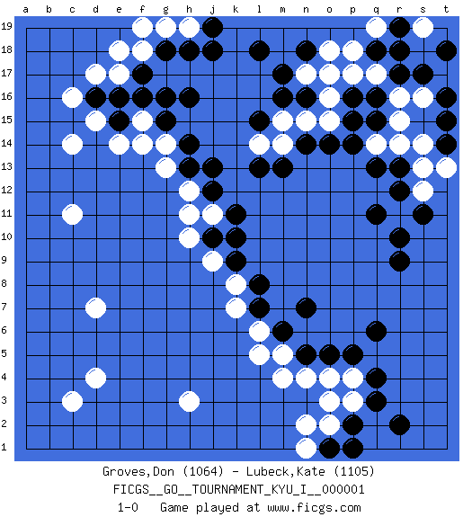 Last move : 1-0 2007 December 17 17:49:53 [Event "FICGS__GO__TOURNAMENT_KYU_I__000001"] [Site "FICGS"] [Date "2007.11.08"] [Round "1"] [Black "Groves,Don"] [White "Lubeck,Kate"] [Result "1-0"] [Rating 1 "1064"] [Rating 2 "1105"] 1.q16 d4 2.q3 d17 3.r9 c11 4.h16 c14 5.m17 m4 6.q6 h3 7.q13 d7 8.k10 j9 9.k9 h11 10.j12 h12 11.j13 k8 12.l8 k7 13.l7 l6 14.m6 l5 15.n5 o3 16.f17 f15 17.e16 d15 18.e15 e14 19.d16 c16 20.g16 g14 21.r17 c3 22.q4 m5 23.n7 n4 24.o5 e17 25.f16 r11 26.q11 s13 27.r12 s12 28.r10 r15 29.s11 s16 30.s17 r16 31.q15 f18 32.g18 e18 33.p2 o2 34.o1 n1 35.p1 p3 36.r2 n2 37.j10 h10 38.h13 g13 39.g15 f14 40.h14 j11 41.k11 r14 42.t14 q14 43.p14 q17 44.q18 p17 45.p16 p18 46.r18 o16 47.p15 n17 48.n18 o18 49.n16 o17 50.l18 n15 51.m16 o15 52.o14 m14 53.n14 m15 54.m13 t17 55.t18 s19 56.t16 t13 57.r13 p4 58.p5 g19 59.h18 h19 60.j18 s14 61.t15 o4 62.j19 f19 63.l15 l14 64.l13 q19 65.r19 1-0 Here are the names of the openings (joseki) played in the four corners : Player Black won this Go (weiqi, baduk) game. Follow this game move after move (download)With only one group, you will win. (Anonymous) When you have everything, sometimes it feels like nothing. (Horatio Caine, C.S.I. Miami)