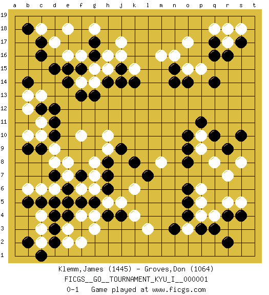 Last move : 0-1 2008 March 22 4:49:19 [Event "FICGS__GO__TOURNAMENT_KYU_I__000001"] [Site "FICGS"] [Date "2007.11.08"] [Round "1"] [Black "Klemm,James"] [White "Groves,Don"] [Result "0-1"] [Rating 1 "1445"] [Rating 2 "1064"] 1.q16 c4 2.r4 d17 3.p3 e3 4.d15 f16 5.c17 c18 6.c16 j17 7.c12 c10 8.f15 g15 9.g16 e16 10.e15 h15 11.b18 e18 12.q10 l3 13.e5 d6 14.f3 f4 15.e4 g3 16.d3 e2 17.d4 c3 18.d2 f2 19.c5 c2 20.b5 c6 21.c1 o17 22.q14 q18 23.n15 r17 24.r16 o15 25.o14 p15 26.n14 r7 27.r9 s5 28.s4 r5 29.o5 q8 30.o9 p9 31.o8 p10 32.o10 q4 33.q3 p4 34.o4 s8 35.s10 p6 36.p11 o3 37.r2 f6 38.e6 e7 39.d7 d8 40.f7 e8 41.f5 g6 42.g5 h5 43.h6 g7 44.h4 j5 45.d5 g4 46.j4 k4 47.h7 g8 48.h8 k6 49.g17 b6 50.b2 g18 51.j15 j16 52.h14 k15 53.j14 g14 54.g13 f14 55.f13 h16 56.k14 n16 57.e14 m16 58.n3 h9 59.k8 m8 60.o6 p5 61.j9 h10 62.s17 s18 63.q17 r18 64.d10 c11 65.d11 b12 66.c9 c13 67.d12 d9 68.b9 b10 69.b14 b13 70.l7 f10 0-1 This go game has been lost on time (started : 2007.11.08 19:32:52) Here are the names of the openings (joseki) played in the four corners : Corner d16 : d17 d15 Komoku (Somok, Xiao~mu`) 3-4 Point. The komoku (3-4) point is the traditional corner enclosure move.. Ikken Takagakari (Hankan Nop'dakeolch'im, Yi Gaogua`jiao~, 1-Space High Approach). The 5-4 approach move has become more popular in modern times, as modern Go emphasizes speed and influence. Corner q16 : q16 o17 Hoshi (Hwajeom, Seongjeom, Xingwei`) 4-4 Point. The star or hoshi (4-4) point, emphasizing influence at the potential expense of territory. Ikken Kakari (Hankan Keolch'im, Yi Gua`jiao~, 1-Space Low Approach). White 2 is the standard approach move to the 4-4. Player White won this Go (weiqi, baduk) game. Follow this game move after move (download)Attach to the strongest stone in a pincer. (Anonymous) The quality of decision is like the well-timed swoop of a falcon which enables it to strike and destroy its victim. (Sun Tzu)
