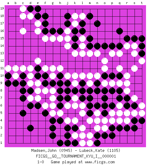 Last move : 1-0 2008 March 16 20:36:24 [Event "FICGS__GO__TOURNAMENT_KYU_I__000001"] [Site "FICGS"] [Date "2007.11.08"] [Round "1"] [Black "Madsen,John"] [White "Lubeck,Kate"] [Result "1-0"] [Rating 1 "0945"] [Rating 2 "1105"] 1.d3 c16 2.q16 q4 3.c5 e16 4.n17 d10 5.j17 r14 6.r6 r8 7.p6 q11 8.r3 r4 9.s4 s5 10.s3 r5 11.p2 o3 12.o2 n3 13.q8 r9 14.q14 q13 15.p14 o12 16.r15 s14 17.s15 p13 18.o8 l8 19.m7 l6 20.l7 k7 21.m6 l5 22.m8 m9 23.n9 m10 24.p10 o11 25.o10 h15 26.l16 l14 27.h8 g7 28.h7 g6 29.h6 h5 30.k8 k9 31.j8 j10 32.g9 g11 33.c8 b10 34.g16 g15 35.g3 h3 36.g4 g5 37.h4 j4 38.j3 h2 39.k3 k4 40.g2 l3 41.j2 e8 42.f10 f11 43.e10 d11 44.n14 m13 45.f17 e17 46.e11 e12 47.k15 j14 48.k14 k13 49.q10 r10 50.r7 s7 51.s6 t6 52.p3 p4 53.n2 m2 54.d8 d9 55.c9 e9 56.c10 c11 57.b9 a11 58.e6 e7 59.d6 j6 60.l9 l10 61.l8 g10 62.f9 n5 63.n6 q9 64.p8 p9 65.o7 o9 66.n8 n10 67.t14 s13 68.t13 t12 69.t15 s11 70.e18 d18 71.f18 l15 72.k16 g8 73.h9 k2 74.h1 l1 75.t4 t5 76.m15 n13 77.m14 l13 78.d19 c18 79.h10 h11 80.f16 f15 81.f5 c19 82.m5 m4 83.o5 n4 84.a9 q6 85.q7 p5 86.h16 q5 87.q3 o4 88.o6 f8 89.a10 b11 90.j9 k10 91.e19 d7 92.c7 j15 93.j7 k6 94.o14 f6 95.n1 j16 96.j1 m1 97.k1 l2 98.pass k17 99.j18 l18 100.l17 k18 101.m18 1-0 Here are the names of the openings (joseki) played in the four corners : Corner q4 : q4 r6 Hoshi (Hwajeom, Seongjeom, Xingwei`) 4-4 Point. The star or hoshi (4-4) point, emphasizing influence at the potential expense of territory. Ikken Kakari (Hankan Keolch'im, Yi Gua`jiao~, 1-Space Low Approach). Black 2 is the standard approach move to the 4-4. Player Black won this Go (weiqi, baduk) game. Follow this game move after move (download)Conservative and slow will win. Believe it ! (Anonymous) It's not the size of the dog in the fight, it's the size of the fight in the dog. (Mark Twain)