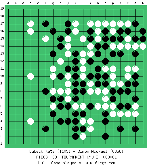 Last move : 1-0 2007 December 1 12:3:30 [Event "FICGS__GO__TOURNAMENT_KYU_I__000001"] [Site "FICGS"] [Date "2007.11.08"] [Round "1"] [Black "Lubeck,Kate"] [White "Simon,Mickael"] [Result "1-0"] [Rating 1 "1105"] [Rating 2 "0856"] 1.q16 d4 2.q3 d16 3.r9 d10 4.k4 k16 5.f3 q5 6.r6 r5 7.q6 p5 8.o4 p6 9.p7 o7 10.p8 n6 11.l8 o17 12.o16 n16 13.o15 r17 14.r16 q17 15.n13 p16 16.p15 p17 17.n9 s16 18.s15 r15 19.q15 s14 20.t15 r14 21.s17 r11 22.s10 s11 23.q13 q14 24.p13 p11 25.n11 q9 26.q8 p9 27.o9 o8 28.r8 r10 29.s9 s6 30.s7 s5 31.s3 l6 32.k7 k6 33.j6 j5 34.k5 m4 35.o5 o6 36.l3 m3 37.o2 h5 38.h6 j7 39.g5 g6 40.h7 j8 41.k8 j9 42.h4 m8 43.l9 m9 44.m10 l10 45.k10 l11 46.k9 j10 47.k11 l12 48.k12 l13 49.k13 o11 50.o12 l2 51.k2 l4 52.k3 n8 53.l5 n10 54.o10 p10 55.n10 n12 56.m12 m13 57.n14 p14 58.o14 m14 59.m15 l15 60.m6 n15 61.m16 n17 62.s13 t14 63.t16 m17 64.f17 f15 65.h15 d17 66.g16 j14 67.j17 k17 68.j16 j15 69.h14 j13 70.g13 h12 71.j11 g11 72.h10 h8 73.j4 g8 74.g7 g10 75.f8 1-0 Here are the names of the openings (joseki) played in the four corners : Corner d4 : d4 f3 Hoshi (Hwajeom, Seongjeom, Xingwei`) 4-4 Point. The star or hoshi (4-4) point, emphasizing influence at the potential expense of territory. Ikken Kakari (Hankan Keolch'im, Yi Gua`jiao~, 1-Space Low Approach). Black 2 is the standard approach move to the 4-4. Corner q16 : q16 o17 Hoshi (Hwajeom, Seongjeom, Xingwei`) 4-4 Point. The star or hoshi (4-4) point, emphasizing influence at the potential expense of territory. Ikken Kakari (Hankan Keolch'im, Yi Gua`jiao~, 1-Space Low Approach). White 2 is the standard approach move to the 4-4. Corner d16 : d16 f17 Hoshi (Hwajeom, Seongjeom, Xingwei`) 4-4 Point. The star or hoshi (4-4) point, emphasizing influence at the potential expense of territory. Ikken Kakari (Hankan Keolch'im, Yi Gua`jiao~, 1-Space Low Approach). Black 2 is the standard approach move to the 4-4. Player Black won this Go (weiqi, baduk) game. Follow this game move after move (download)Don't reduce your own liberties. (Bill Taylor) If we knew what we were doing, we would not call it research. (Albert Einstein)
