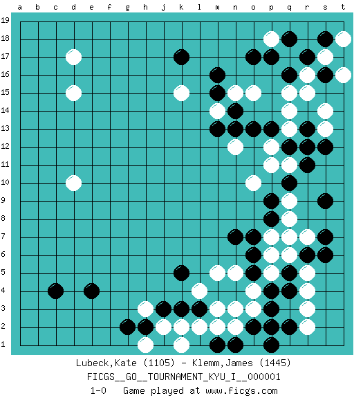 Last move : 1-0 2008 March 18 16:42:44 [Event "FICGS__GO__TOURNAMENT_KYU_I__000001"] [Site "FICGS"] [Date "2007.11.08"] [Round "1"] [Black "Lubeck,Kate"] [White "Klemm,James"] [Result "1-0"] [Rating 1 "1105"] [Rating 2 "1445"] 1.q16 d17 2.c4 r4 3.e4 d10 4.l3 d15 5.p4 p5 6.o5 p6 7.n7 o4 8.p3 o3 9.o2 n2 10.q2 o1 11.p2 m3 12.n4 n3 13.m4 l2 14.k3 k2 15.j3 r2 16.p1 j2 17.h2 h1 18.n1 m2 19.j1 k1 20.m1 n5 21.o6 h3 22.g2 l4 23.k5 m5 24.q4 r5 25.q5 q6 26.r6 q8 27.s6 r3 28.q7 p7 29.p8 r7 30.o7 q7 31.s7 q9 32.r13 o10 33.k17 k15 34.m16 q17 35.p17 p18 36.o17 r16 37.r17 q15 38.q18 r15 39.p13 o15 40.n14 q13 41.q12 q14 42.r11 p12 43.o13 s13 44.s12 s14 45.s9 n15 46.m15 m14 47.m13 s17 48.s18 t18 49.s16 t16 50.t17 q11 51.r12 s17 52.q10 p11 53.t17 n12 54.n13 s17 55.p9 1-0 This go game has been lost on time (started : 2007.11.08 19:32:52) Here are the names of the openings (joseki) played in the four corners : Corner q4 : r4 l3 Komoku (Somok, Xiao~mu`) 3-4 Point. The komoku (3-4) point is the traditional corner enclosure move.. Player Black won this Go (weiqi, baduk) game. Follow this game move after move (download)Go uses the most elemental materials and concepts - line and circle, wood and stone, black and white - combining them with simple rules to generate subtle strategies and complex tactics that stagger the imagination. (Iwamoto Kaoru, 9 dan professional Go player and former Honinbo title holder) You cannot beat a roulette table unless you steal money from it. (Albert Einstein)