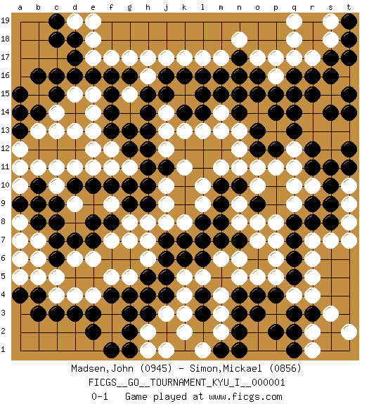 Last move : 0-1 2008 October 14 10:9:53 [Event "FICGS__GO__TOURNAMENT_KYU_I__000001"] [Site "FICGS"] [Date "2007.11.08"] [Round "1"] [Black "Madsen,John"] [White "Simon,Mickael"] [Result "0-1"] [Rating 1 "0945"] [Rating 2 "0856"] 1.q16 d4 2.d17 q4 3.c15 k17 4.c6 f3 5.n17 g17 6.o3 r6 7.l3 j3 8.c3 c4 9.b4 b5 10.b3 c5 11.e2 f2 12.e3 e4 13.d3 d6 14.c7 r14 15.r12 r17 16.r16 q17 17.s17 o17 18.o16 p16 19.p15 p17 20.n15 s18 21.s16 n18 22.p12 c11 23.d7 e6 24.e7 c14 25.d14 c13 26.r9 b15 27.c16 d13 28.b16 e14 29.f16 f17 30.e16 d15 31.b14 b13 32.a15 m17 33.n16 g15 34.g16 h16 35.e10 f7 36.f8 g8 37.g9 f9 38.e8 g7 39.g10 o14 40.n14 q11 41.r11 n13 42.o13 n12 43.l15 p3 44.o4 p13 45.o12 q12 46.q13 o11 47.p14 p11 48.o15 q9 49.q8 r10 50.s10 q10 51.s8 p8 52.q7 p7 53.q6 p6 54.q5 p5 55.p4 r5 56.q3 r4 57.r3 s7 58.r8 s3 59.p2 r2 60.q2 r1 61.q1 t2 62.l6 k8 63.j5 k4 64.l4 k5 65.k6 l5 66.m5 m6 67.m7 n6 68.j7 j8 69.l8 l9 70.m9 l10 71.o9 n8 72.m8 n9 73.m10 m11 74.n10 o10 75.n7 o8 76.j4 k3 77.h3 h2 78.j2 k2 79.g2 j1 80.g3 m2 81.f4 f5 82.g4 n5 83.n2 m3 84.c9 l13 85.g12 f11 86.f10 g11 87.k14 k13 88.h11 f12 89.g13 j13 90.h9 h8 91.f13 e12 92.h12 j10 93.h10 a8 94.b8 a7 95.a9 a6 96.j16 j17 97.h15 h17 98.f15 e13 99.h14 e15 100.k16 g5 101.h5 e18 102.d18 e17 103.d16 j14 104.j15 d19 105.c19 e19 106.c18 c10 107.b10 b11 108.n4 m4 109.d10 a12 110.j11 j9 111.m16 l17 112.t18 s19 113.k7 k11 114.l14 r13 115.q15 s12 116.s11 t13 117.s14 s15 118.t15 t8 119.r15 r7 120.s9 s13 121.q14 t9 122.t14 t10 123.t12 n11 124.j6 o7 125.l7 h6 126.f1 a11 127.m1 l1 128.n1 a10 129.b9 h7 130.h4 m14 131.t11 t7 132.a4 d11 133.g1 h1 134.m15 m13 135.f14 o5 136.a14 j12 137.t17 q19 138.pass b6 139.l16 pass 140.pass b7 141.n3 e11 142.t19 d9 143.c8 q18 144.a13 a5 145.h13 pass 146.pass pass 147.pass pass 148.pass pass 0-1 Here are the names of the openings (joseki) played in the four corners : Corner d4 : d4 c6 Hoshi (Hwajeom, Seongjeom, Xingwei`) 4-4 Point. The star or hoshi (4-4) point, emphasizing influence at the potential expense of territory. Ikken Kakari (Hankan Keolch'im, Yi Gua`jiao~, 1-Space Low Approach). Black 2 is the standard approach move to the 4-4. Corner q4 : q4 o3 Hoshi (Hwajeom, Seongjeom, Xingwei`) 4-4 Point. The star or hoshi (4-4) point, emphasizing influence at the potential expense of territory. Ikken Kakari (Hankan Keolch'im, Yi Gua`jiao~, 1-Space Low Approach). Black 2 is the standard approach move to the 4-4. Player White won this Go (weiqi, baduk) game. Follow this game move after move (download)Don't defend - extend ! (Bill Taylor) The beginning of wisdom is silence. The second step is listening. (Unknown)