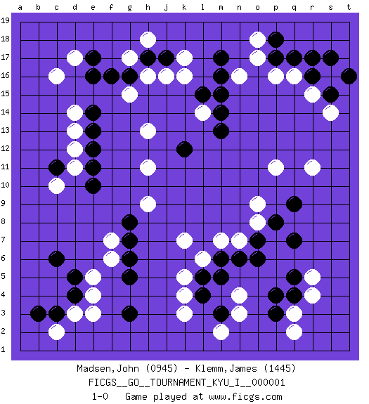 Last move : 1-0 2008 March 24 17:1:14 [Event "FICGS__GO__TOURNAMENT_KYU_I__000001"] [Site "FICGS"] [Date "2007.11.08"] [Round "1"] [Black "Madsen,John"] [White "Klemm,James"] [Result "1-0"] [Rating 1 "0945"] [Rating 2 "1445"] 1.d4 q3 2.r16 c16 3.p17 r5 4.e17 d14 5.h17 c10 6.c6 k3 7.g3 r11 8.m3 k5 9.l4 k4 10.l5 l6 11.m6 m7 12.n6 n7 13.o6 k7 14.o7 o8 15.q7 n4 16.p4 n3 17.p3 m2 18.m5 q2 19.q4 r4 20.p8 o9 21.q9 p11 22.q5 s16 23.s17 r15 24.s15 q16 25.r17 s14 26.t16 p16 27.m13 j16 28.j17 k16 29.m15 o17 30.p18 k17 31.m17 n16 32.m16 o18 33.q17 d17 34.e16 h16 35.g16 g15 36.k12 l14 37.m14 g17 38.f16 h18 39.e14 d13 40.e13 h13 41.l15 h11 42.e11 h9 43.c11 d12 44.e12 d11 45.e10 d3 46.c3 e3 47.g5 c2 48.b3 e4 49.d5 e5 50.g7 f6 51.g6 f7 52.g8 1-0 This go game has been lost on time (started : 2007.11.08 19:32:52) Here are the names of the openings (joseki) played in the four corners : Corner d16 : c16 e17 Komoku (Somok, Xiao~mu`) 3-4 Point. The komoku (3-4) point is the traditional corner enclosure move.. Ikken Kakari (Hankan Keolch'im, Yi Gua`jiao~, 1-Space Low Pincer). The small knight move is the basic approach move to the 3-4 point stone. It has been continually used for over four centuries. There are limitless variations, with new moves constantly being discovered. Black 2 opens the door to a treaure store of joseki. Player Black won this Go (weiqi, baduk) game. Follow this game move after move (download)Studying go is a wonderful way to develop both the creative as well as the logical abilities of children because to play it both sides of the brain are necessary. (Cho Chikun) I know the human being and fish can coexist peacefully. (George W. Bush, Saginaw sept. 29, 2000)