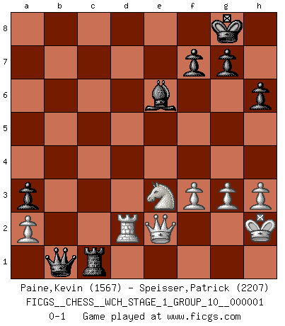 Last move : 0-1 2006 September 17 13:57:42 [Event "FICGS__CHESS__WCH_STAGE_1_GROUP_10__000001"] [Site "FICGS"] [Date "2006.07.01"] [Round "1"] [White "Paine,Kevin"] [Black "Speisser,Patrick"] [Result "0-1"] [WhiteElo "1567"] [BlackElo "2207"] 1.e4 e5 2.Nf3 Nc6 3.Bb5 a6 4.Ba4 Nf6 5.O-O Be7 6.Re1 b5 7.Bb3 d6 8.c3 O-O 9.h3 Na5 10.Bc2 c5 11.d4 Qc7 12.Nbd2 cxd4 13.cxd4 Bb7 14.Nf1 Rac8 15.Bd3 exd4 16.Nxd4 d5 17.exd5 Nxd5 18.Be4 Rfe8 19.Bxd5 Bxd5 20.Nf5 Be6 21.Nxe7+ Qxe7 22.b3 Nc6 23.Bb2 Nb4 24.Ba3 Qh4 25.Bxb4 Qxb4 26.Rc1 h6 27.Ne3 Rxc1 28.Qxc1 Rc8 29.Qd1 a5 30.Qe2 a4 31.bxa4 bxa4 32.Rd1 a3 33.Nd5 Qb7 34.Ne3 Qb2 35.Rd2 Rc1+ 36.Kh2 Qe5+ 37.g3 Qe4 38.f3 Qb1 0-1 Ruy Lopez : Closed Kingside Castling by player White (move 5) Kingside Castling by player Black (move 8) Player Black won this chess game. Follow this game move after move (download)Chess is the art of analysis. (Mikhail Botvinnik) Frage des Reporters: -Welche besonderen Umstände rechtfertigen das Anhalten der Uhren während einer Turnierpartie? Antwort: -Einen Fotographen zu strangulieren. (Siegbert Tarrasch) Cada Peón es una Reina en potencia. (James Mason) Karpov est une pièce de musée. (Garry Kasparov) There's no money in correspondence chess. (John Knudsen)