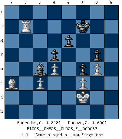 Last move : 1-0 2007 December 28 12:44:46 [Event "FICGS__CHESS__CLASS_E__000067"] [Site "FICGS"] [Date "2007.11.09"] [Round "1"] [White "Barradas,Anderson"] [Black "Dsouza,Stanislaus"] [Result "1-0"] [WhiteElo "1312"] [BlackElo "1600"] 1.e4 b6 2.d4 Bb7 3.Nc3 e6 4.Nf3 Bb4 5.a3 Be7 6.Bd3 Nf6 7.O-O O-O 8.Re1 d5 9.e5 c5 10.exf6 Bxf6 11.dxc5 Bxc3 12.bxc3 g6 13.Be3 Na6 14.Bxa6 Bxa6 15.cxb6 axb6 16.Rb1 Rb8 17.Ne5 Qd6 18.Qd4 b5 19.Bf4 Qc7 20.Nd3 Qb6 21.Nc5 Rbd8 22.Bg5 Rb8 23.Nd7 Qxd4 24.cxd4 Kg7 25.Nxb8 Rxb8 26.Rb4 h6 27.Bf4 Rc8 28.Rc1 Rc3 29.Rb3 Rc4 30.Rb4 g5 31.Be3 Rc3 32.Rb3 Rc4 33.c3 Kg6 34.g4 f5 35.h3 f4 36.Bd2 h5 37.f3 hxg4 38.hxg4 Kf6 39.Rb4 Rc6 40.a4 bxa4 41.Rxa4 Bc4 42.Rca1 Rb6 43.Bc1 Be2 44.Kf2 Bd1 45.Ra6 Rxa6 46.Rxa6 Bb3 47.Rb6 Bc4 48.Ba3 Kf7 49.Rb7+ 1-0 Owen defense Kingside Castling by player White (move 7) Kingside Castling by player Black (move 7) Player White won this chess game. Follow this game move after move (download)Chess is a beautiful mistress. (Bent Larsen) Wenn Schach ein enormer Dschungel ist, der seine Myriaden von Geheimnissen nicht preisgeben will, dann sind Computer die Kettensägen einer gewaltigen ökologisch unsensiblen Nutzholzfirma. (Nigel Short) No es una movida, aún la mejor movida que tu debas buscar, sino un plan comprensible. (Eugene Znosko-Borovsky) Si je n'étais pas joueur d'échecs, je serais le meilleur dans quelque chose d'autre. (Anatoli Karpov) I think your argument is specious - I think your tie is ugly. (Gregory House to Dr. Foreman, House M.D.)