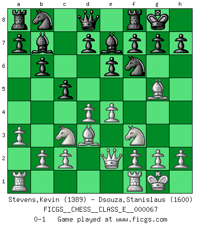 Last move : 0-1 2007 December 24 9:47:39 [Event "FICGS__CHESS__CLASS_E__000067"] [Site "FICGS"] [Date "2007.11.09"] [Round "1"] [White "Stevens,Kevin"] [Black "Dsouza,Stanislaus"] [Result "0-1"] [WhiteElo "1389"] [BlackElo "1600"] 1.d4 b6 2.e4 Bb7 3.Bd3 e6 4.Nf3 Nf6 5.Qe2 Be7 6.O-O O-O 7.Nc3 Bb4 8.a3 Be7 9.Bg5 c5 0-1 This chess game has been lost on time (started : 2007.11.09 8:36:39) Queen's pawn : English defense Kingside Castling by player White (move 6) Kingside Castling by player Black (move 6) Player Black won this chess game. Follow this game move after move (download)Chess is a foolish expedient for making idle people believe they are doing something very clever when they are only wasting their time. (George Bernard Shaw) Mutter, ich bin eben Ex-Weltmeister geworden. --beim nach Hause Kommen nach dem Verlust des WM-Titels an Mihail Botvinnik -- (Mikhail Nekhemyevich Tal) Hay dos clases de hombres: aquellos que se conforman en dejarse llevar por las circunstancias y que juegan barajas y aquellos decididos a controlar las circunstancias y que juegan al Ajedrez. (Mortimer Collins) Une platitude souvent récitée à propos des Echecs est qu'une des choses les plus difficiles à réaliser est de gagner une position gagnante. Cela ne manque pas de sens mais, pour ma part, j'ai toujours trouvé plus difficile de gagner une position perdante. (Tim Krabbe) There's always a bigger fish. (Qui-Gon Jinn in Star Wars ep.1)
