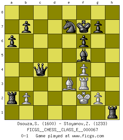 Last move : 0-1 2007 November 17 21:30:39 [Event "FICGS__CHESS__CLASS_E__000067"] [Site "FICGS"] [Date "2007.11.09"] [Round "1"] [White "Dsouza,Stanislaus"] [Black "Stoyanov,Zdravko"] [Result "0-1"] [WhiteElo "1600"] [BlackElo "1233"] 1.d4 d5 2.Nf3 Nc6 3.e3 a6 4.Bd3 e6 5.c3 Bd6 6.Nbd2 Nf6 7.e4 dxe4 8.Nxe4 Nxe4 9.Bxe4 Ne7 10.O-O O-O 11.Bxh7+ Kxh7 12.Ng5+ Kg6 13.Qg4 e5 14.Qd1 f6 15.Ne4 Rh8 16.f4 exd4 17.Qd3 Bf5 18.Qg3+ Kf7 19.Nxd6+ Qxd6 20.cxd4 Qxd4+ 21.Kh1 Qd5 22.Be3 Rh3 23.Qf2 Rah8 24.Qd2 Rxh2+ 25.Kg1 Qe4 26.Rf3 Rh1+ 27.Kf2 Rxa1 28.Qc3 R8h1 29.Qxc7 Rxa2 30.Qc4+ Qxc4 0-1 Queen's pawn game, Chigorin variation Kingside Castling by player White (move 10) Kingside Castling by player Black (move 10) Player Black won this chess game. Follow this game move after move (download)Human affairs are like a Chess game: only those who do not take it seriously can be called good players. (Hung Tzu Ch'eng) Intelligenz läßt sich nicht am Weg, sondern nur am Ergebnis feststellen. (Garry Kasparov) Si tu oponente no puede hacer nada activo, entonces no apures la posición; En vez de eso, dejalo estar sentado ahí, sufriendo y rogandote por un empate. (Jeremy Silman) Les pièces de l'échiquier étaient impitoyables. Elles le retenaient, elles l'absorbaient. Il y avait de l'horreur en cela, mais aussi une harmonie unique. Car, qu'y a-t-il dans le monde, à part les échecs ? (V. Nabokov) Perhaps the current trend of many chess professionals taking up the more lucrative pastime of poker is not a wholly negative one. It may not be too late for humans to relearn how to take risks in order to innovate and thereby maintain the advanced lifestyles we enjoy. And if it takes a poker-playing supercomputer to remind us that we can't enjoy the rewards without taking the risks, so be it. (The Chess Master and the Computer, by Garry Kasparov - 2010)