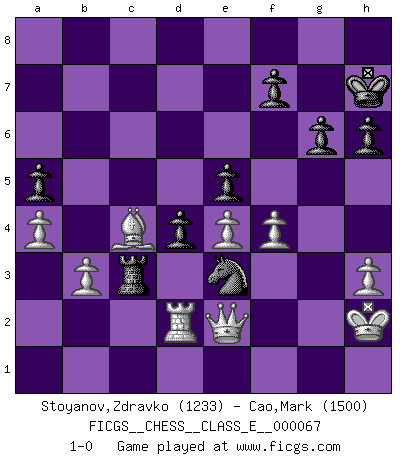 Last move : 1-0 2007 December 9 21:38:3 [Event "FICGS__CHESS__CLASS_E__000067"] [Site "FICGS"] [Date "2007.11.09"] [Round "1"] [White "Stoyanov,Zdravko"] [Black "Cao,Mark"] [Result "1-0"] [WhiteElo "1233"] [BlackElo "1500"] 1.e4 c5 2.Nf3 d6 3.h3 g6 4.a3 Bg7 5.Be2 Nf6 6.c3 O-O 7.d3 Nc6 8.O-O Be6 9.c4 a6 10.Ng5 Bd7 11.Be3 Rb8 12.Nc3 h6 13.Nf3 e5 14.Qd2 Kh7 15.Qc1 Nd4 16.Bxd4 cxd4 17.Nd1 Qc7 18.b3 b5 19.Kh1 Qc8 20.Kh2 Bc6 21.Qd2 Qd7 22.Qa5 Ra8 23.a4 Nh5 24.Nb2 Nf4 25.Qd2 bxc4 26.Nxc4 Rab8 27.Na5 Bf6 28.Rfc1 Rfc8 29.Bd1 Bd8 30.Nxc6 Rxc6 31.Rxc6 Qxc6 32.Rc1 Qd7 33.Ng1 Bg5 34.Qc2 Rb7 35.Bg4 Qe7 36.Nf3 Nxd3 37.Nxg5+ Qxg5 38.Rd1 Nb4 39.Qc8 Qe7 40.Be2 Rc7 41.Qg4 Rc3 42.Bc4 a5 43.f4 Nc2 44.Qe2 Ne3 45.Rd2 Qh4 46.fxe5 Qf4+ 47.g3 dxe5 48.gxf4 1-0 Sicilian Kingside Castling by player Black (move 6) Kingside Castling by player White (move 8) Player White won this chess game. Follow this game move after move (download)Place the contents of the Chess box in a hat, shake them up vigorously, pour them on the board from a height of two feet, and you get the style of Steinitz. (H. E. Bird) Es genügt nicht ein guter Spieler zu sein, man muß auch gut spielen. (Siegbert Tarrasch) En la vida, como en el Ajedrez, los Peones propios obstruyen nuestro camino. La gran fortuna de un hombre, su comodidad, placer, hijos, libros, que deberían ayudarle a ganar, con mucha frecuencia lo ponen en Jaque Mate. (Charles Buxton) Les échecs, c'est l'art d'analyser. (Mikhail Botvinnik) Every now and then a man's mind is stretched by a new idea and never shrinks back to its former dimensions. (Oliver Wendell Holmes, Sr.)