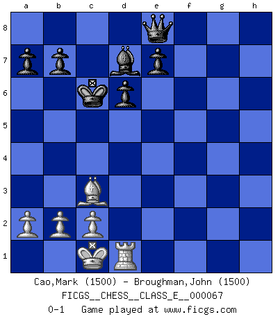 Last move : 0-1 2007 December 7 2:6:37 [Event "FICGS__CHESS__CLASS_E__000067"] [Site "FICGS"] [Date "2007.11.09"] [Round "1"] [White "Cao,Mark"] [Black "Broughman,John"] [Result "0-1"] [WhiteElo "1500"] [BlackElo "1500"] 1.e4 c5 2.Nf3 d6 3.d4 cxd4 4.Nxd4 Nf6 5.Nc3 g6 6.Be3 Bg7 7.Qd2 O-O 8.O-O-O Nc6 9.h4 h5 10.f3 Kh7 11.g4 Bd7 12.Be2 Rc8 13.Rdg1 Ne5 14.gxh5 Nxh5 15.f4 Nc4 16.f5 Nxd2 17.fxg6+ fxg6 18.Bxh5 Rf1 19.Rxf1 Nxf1 20.Bxg6+ Kxg6 21.h5+ Kh7 22.Rxf1 Qe8 23.h6 Bxd4 24.Bxd4 Rxc3 25.Bxc3 Kxh6 26.Rh1+ Kg5 27.Rg1+ Kf4 28.Rf1+ Kxe4 29.Re1+ Kd5 30.Rd1+ Kc6 0-1 Sicilian : Dragon, 6.Be3 Kingside Castling by player Black (move 7) Queenside Castling by player White (move 8) Player Black won this chess game. Follow this game move after move (download)You must take your opponent into a deep dark forest where 2+2=5, and the path leading out is only wide enough for one. (Mikhail Tal) Das Schach hält seine Meister in eigenen Banden, Fesseln; auf vielerlei Weise formt es ihren Geist, so dass die innere Freiheit selbst des Stärksten beeinflusst wird. (Albert Einstein) En partidas rápidas, el Caballo es mas poderoso que el Alfil. (Vlastimil Hort) Les échecs sont un jeu par leur forme, un art par leur essence et une science par sa difficulté d'acquisition. Ils peuvent vous procurer autant de plaisir qu'un bon livre ou une belle musique, mais vous n'aurez une réelle joie que si vous arrivez à bien jouer. (Tigran Petrosian) He is a liar. I just don't know what the lie is yet. (Horatio Caine, C.S.I. Miami)
