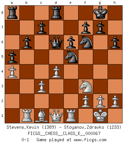 Last move : 0-1 2008 February 3 0:34:1 [Event "FICGS__CHESS__CLASS_E__000067"] [Site "FICGS"] [Date "2007.11.09"] [Round "1"] [White "Stevens,Kevin"] [Black "Stoyanov,Zdravko"] [Result "0-1"] [WhiteElo "1389"] [BlackElo "1233"] 1.d4 d5 2.c4 b6 3.cxd5 Qxd5 4.Nc3 Qd8 5.e4 e6 6.Nf3 h6 7.Bb5+ Bd7 8.Bxd7+ Qxd7 9.O-O Nf6 10.Re1 Bb4 11.a3 Bxc3 12.bxc3 O-O 13.Rb1 Rd8 14.Ne5 Qd6 15.a4 Nc6 16.Nf3 a5 17.e5 Nxe5 0-1 This chess game has been lost on time (started : 2007.11.09 8:36:39) Queen's Gambit Kingside Castling by player White (move 9) Kingside Castling by player Black (move 12) Player Black won this chess game. Follow this game move after move (download)Of all my Russian books, the defense contains and diffuses the greatest 'warmth' which may seem odd seeing how supremely abstract Chess is supposed to be. (Vladimir Nabokov) Schach sollte überall auf der Welt Schulfach werden. Es fördert die geistige Auseinandersetzung. Es lehrt die Demut in der Niederlage. (Garry Kasparov) No puedes jugar al Ajedrez si eres de corazón noble. (Proverbio Francés) Plusieurs personnes se sont demandées comment Tal faisait pour gagner... En fait, c'est très simple ! Il met ses pièces au centre de l'échiquier et les sacrifie quelque part ! (David Bronstein) There are lots of people who mistake their imagination for their memory. (Josh Bilings)