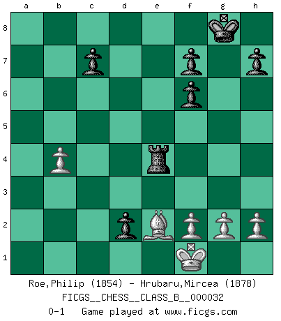 Last move : 0-1 2008 August 10 22:33:37 [Event "FICGS__CHESS__CLASS_B__000032"] [Site "FICGS"] [Date "2007.11.09"] [Round "1"] [White "Roe,Philip"] [Black "Hrubaru,Mircea"] [Result "0-1"] [WhiteElo "1854"] [BlackElo "1878"] 1.b4 d5 2.Bb2 Bf5 3.e3 Nf6 4.Nf3 e6 5.c4 Nbd7 6.c5 a5 7.a3 axb4 8.axb4 Rxa1 9.Bxa1 Qa8 10.Nc3 Qa3 11.Qa4 Qc1+ 12.Nd1 Be7 13.Qa8+ Bd8 14.Be2 Qb1 15.Bxf6 Nxf6 16.Qxb7 O-O 17.O-O Qc2 18.Nc3 Ne4 19.Nd4 Qxd2 20.Nxe4 Bxe4 21.Qb5 Bf6 22.Rd1 Qc3 23.Bf1 e5 24.Ne2 Qc2 25.Rc1 Qb2 26.c6 d4 27.Qc5 Ra8 28.Ng3 Bg6 29.exd4 exd4 30.Re1 d3 31.Qa5 Rf8 32.Nf5 Qc2 33.Ne3 Qxc6 34.Nd5 d2 35.Rd1 Qc1 36.Nxf6+ gxf6 37.Qa1 Qxa1 38.Rxa1 Re8 39.Rd1 Rd8 40.Be2 Bc2 41.Kf1 Bxd1 42.Bxd1 Re8 43.Be2 Re4 0-1 Polish (Sokolsky) opening Kingside Castling by player Black (move 16) Kingside Castling by player White (move 17) Player Black won this chess game. Follow this game move after move (download)Pawns: they are the soul of this game, they alone form the attack and defense. (Philidor) Die Arbeit ist etwas Unnatürliches. Die Faulheit allein ist göttlich. (Anatole France) Los Peones son nacidos libres, y aún así, se encuentran por doquier encadenados. (Rick Kennedy) La tactique est l'élément le plus important du milieu de jeu. (Siegbert Tarrasch) Over-the-board chess is the favorite of mortals, correspondence chess is the favorite of the gods. (Eduard Dyckhoff)