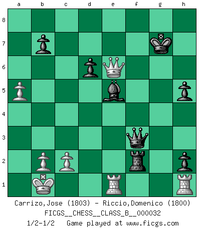Last move : 1/2-1/2 2008 March 11 19:54:52 [Event "FICGS__CHESS__CLASS_B__000032"] [Site "FICGS"] [Date "2007.11.09"] [Round "1"] [White "Carrizo,Jose"] [Black "Riccio,Domenico"] [Result "1/2-1/2"] [WhiteElo "1803"] [BlackElo "1800"] 1.e4 c5 2.Nf3 d6 3.d4 cxd4 4.Nxd4 Nf6 5.Nc3 e6 6.g4 Be7 7.g5 Nfd7 8.Qh5 O-O 9.Be3 Nc6 10.Rg1 Nxd4 11.Bxd4 e5 12.Be3 Nb6 13.Rg3 Bd7 14.Bh3 g6 15.Qh6 f5 16.gxf6 Bxf6 17.Bxd7 Qxd7 18.Bxb6 axb6 19.O-O-O Rf7 20.h4 Bg7 21.Qe3 b5 22.h5 gxh5 23.Nd5 Raf8 24.Qg5 Kh8 25.Kb1 Rxf2 26.Ne7 R2f7 27.Nf5 Rxf5 28.exf5 Rxf5 29.Qd2 e4 30.Rdg1 h4 31.Rg4 h3 32.Qe2 Qf7 33.Rxe4 Be5 34.Qxb5 h2 35.Rh1 Rf2 36.R4e1 Qg6 37.Qc4 Kg7 38.a4 h5 39.a5 Kh6 40.Rd1 Qf7 41.Qd3 Qf5 42.Qc4 Kg5 43.Rde1 Qf3 44.Qg8+ Kh6 45.Qe6+ Kg7 1/2-1/2 Sicilian : Scheveningen, Keres attack Kingside Castling by player Black (move 8) Queenside Castling by player White (move 19) This chess game ended in a draw. Follow this game move after move (download)Many have become Chess Masters, no one has become the Master of Chess. (Siegbert Tarrasch) Pläne sind die Träume des Verständigen. (Ernst Freiherr von Feuchtersleben) En la perfecta combinación de Ajedrez como en una historia corta de primera clase, toda la trama y contra trama deberá conducir hacia un final sorprendente, el interes no es mitigado hasta el último momento. (Yates and Winter) Les échecs c'est le défi de l'alpiniste, toujours plus haut, prêt à tout pour monter à l'assaut du Roi ennemi. Les échecs, c'est de la musique en mouvement, un ballet majestueux pour les yeux. C'est de la poésie composée par les fantômes du passé qui au même titre que Rimbaud ou Verlaine méritent notre admiration. Les échecs, c'est de la peinture ou le moindre mouvement modifie le tableau pour en faire un Picasso ou un Van Gogh. Les échecs, c'est tout et rien, c'est la vie et la mort. Jjulie33 sur le forum de France-Echecs. Computers are like Old Testament gods; lots of rules and no mercy. (Joseph Campbell)