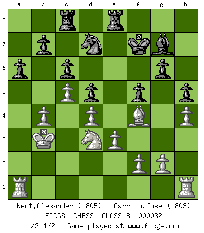 Last move : 1/2-1/2 2008 March 4 13:52:30 [Event "FICGS__CHESS__CLASS_B__000032"] [Site "FICGS"] [Date "2007.11.09"] [Round "1"] [White "Nent,Alexander"] [Black "Carrizo,Jose"] [Result "1/2-1/2"] [WhiteElo "1805"] [BlackElo "1803"] 1.d4 d5 2.c4 e6 3.Nc3 c6 4.cxd5 exd5 5.Bf4 Nf6 6.Qc2 g6 7.Nf3 Bf5 8.Qb3 Qb6 9.e3 Qxb3 10.axb3 Nbd7 11.h3 h5 12.Be2 Be7 13.Ne5 Bc2 14.Bd1 Bxd1 15.Kxd1 a6 16.Nd3 O-O 17.b4 Rfe8 18.Kc2 Nf8 19.Nc5 Ne6 20.Bg3 Nxc5 21.bxc5 Nd7 22.b4 Kg7 23.Kb3 f5 24.h4 Kf7 25.Nd1 Rac8 26.Nb2 Bd8 27.Bf4 Bf6 28.Nd3 Bg7 1/2-1/2 QGD : Semi-Slav Kingside Castling by player Black (move 16) This chess game ended in a draw. Follow this game move after move (download)I believe that Chess possesses a magic that is also a help in advanced age. A rheumatic knee is forgotten during a game of Chess and other events can seem quite unimportant in comparison with a catastrophe on the chessboard. (Vlastimil Hort) Früher wurde jeder komplizierte Zug, jedes interessante Opfer mit großem Beifall und Enthusiasmus aufgenommen. Heute schaltet man einfach seinen Fritz an, und man kann sehen, was los ist, ob der Zug geht oder nicht. (Vladimir Kramnik) Personalmente, yo prefiero mirar hacia el futuro en donde un programa de computadora gane el título mundial de Ajedrez. La humanidad necesita una lección de humildad. (Richard Dawkings) Les Echecs sont et restent toujours un combat, un combat intégral comme la boxe, la lutte ou un autre sport, et où il doit y avoir un vainqueur et un vaincu. (Joseph Emil Diemer) Success without honor is an unseasoned dish; it will satisfy your hunger, but it won't taste good. (Joe Paterno)